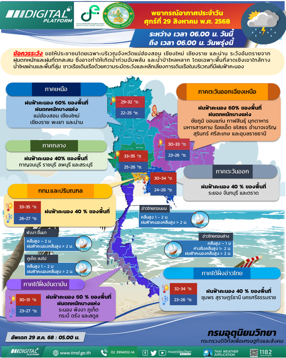 ลักษณะอากาศทั่วไป พยากรณ์อากาศ 24 ชั่วโมงข้างหน้า ประเทศไทยยังคงมีฝนฟ้าคะนอง และมีฝนตกหนักบางแห่งบริเวณภาคเหนือ ภาคตะวันออกเฉียงเหนือ และภาคใต้ฝั่งตะวันตก ขอให้ประชาชนโดยเฉพาะบริเวณจังหวัดแม่ฮ่องสอน เชียงใหม่ เชียงราย และน่าน ระวังอันตรายจากฝนตกหนัก และฝนที่ตกสะสม ซึ่งอาจทำให้เกิดน้ำท่วมฉับพลัน และน้ำป่าไหลหลาก โดยเฉพาะพื้นที่ลาดเชิงเขาใกล้ทางน้ำไหลผ่านและพื้นที่ลุ่ม