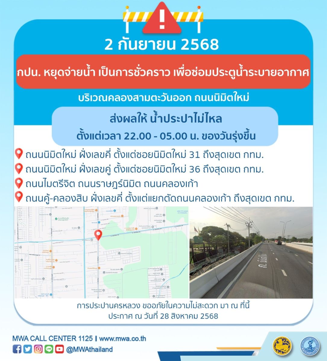 การประปานครหลวง (กปน.) ขอแจ้งให้ทราบว่า จะดำเนินการซ่อมประตูน้ำระบายอากาศ ในพื้นที่บริเวณคลองสามตะวันออก ถนนนิมิตใหม่ เพื่อให้ประชาชนได้รับบริการน้ำประปาอย่างเพียงพอและทั่วถึง จึงมีความจำเป็นต้องหยุดจ่ายน้ำ เป็นการชั่วคราว ในคืนวันอังคารที่ 2 กันยายน 2568 ตั้งแต่เวลา 22.00 - 05.00 น. ของวันรุ่งขึ้น โดยระหว่างดำเนินการ ส่งผลให้ น้ำประปาไม่ไหล ในพื้นที่ดังต่อไปนี้