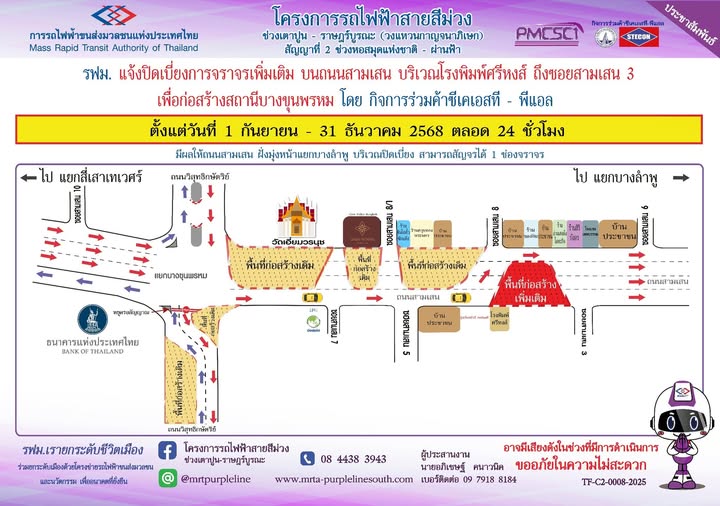 รฟม. แจ้งปิดเบี่ยงจราจรเพิ่มเติม บนถนนสามเสน บริเวณโรงพิมพ์ศรีหงส์ ถึง ซอยสามเสน 3 เพื่อก่อสร้างสถานีบางขุนพรหม โครงการรถไฟฟ้าสายสีม่วง ช่วงเตาปูน - ราษฎร์บูรณะ (วงแหวนกาญจนาภิเษก) ตั้งแต่วันที่ 1 กันยายน - 31 ธันวาคม 2568 ตลอด 24 ชั่วโมง