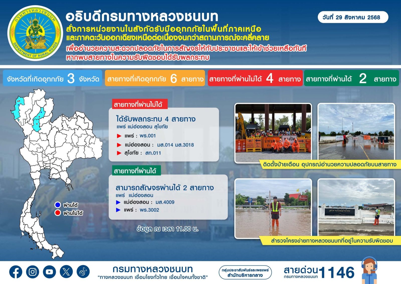 ซึ่งขณะนี้ (29 ส.ค. 68 เวลา 11.00 น.) สำนักบำรุงทาง กรมทางหลวงชนบท ได้รายงานสายทางที่ได้รับผลกระทบในปัจจุบันรวมทั้งสิ้น 6 สายทาง ใน 3 จังหวัด ได้แก่ จังหวัดแพร่ จังหวัดแม่ฮ่องสอน จังหวัดสุโขทัย แบ่งเป็น สัญจรผ่านไม่ได้ 4 สายทาง สัญจรผ่านได้ 2 สายทาง ดังนี้