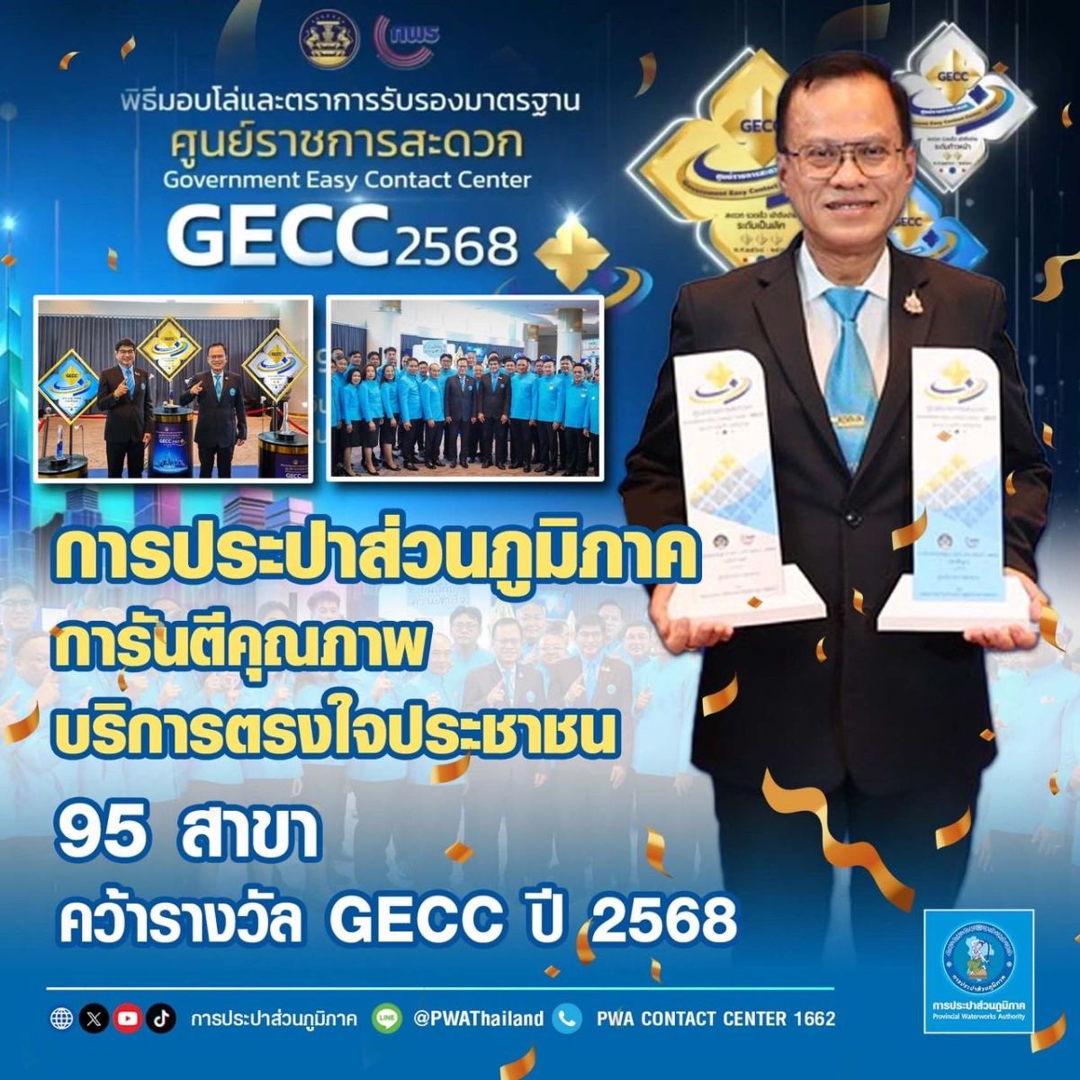 การประปาส่วนภูมิภาค (กปภ.) ปลื้มได้รับโล่และตรารับรองมาตรฐานการให้บริการของศูนย์ราชการสะดวก (GECC) ประจำปี 2568 จำนวน 95 สาขา การันตีคุณภาพบริการ สะดวกจริงรวดเร็ว เข้าถึงง่าย ตรงใจประชาชน