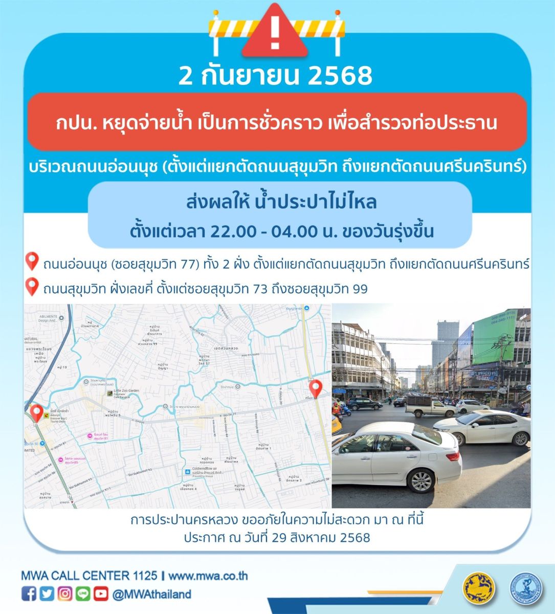 การประปานครหลวง (กปน.) ขอแจ้งให้ทราบว่า จะดำเนินการสำรวจท่อประธาน ในพื้นที่บริเวณถนนอ่อนนุช (ซอยสุขุมวิท 77) (ตั้งแต่แยกตัดถนนสุขุมวิท ถึงแยกตัดถนนศรีนครินทร์) เพื่อให้ประชาชนได้รับบริการน้ำประปาอย่างเพียงพอและทั่วถึง จึงมีความจำเป็นต้องหยุดจ่ายน้ำ เป็นการชั่วคราว ในคืนวันอังคารที่ 2 กันยายน 2568 ตั้งแต่เวลา 22.00 - 04.00 น. ของวันรุ่งขึ้น โดยระหว่างดำเนินการ ส่งผลให้ น้ำประปาไม่ไหล ในพื้นที่ดังต่อไปนี้