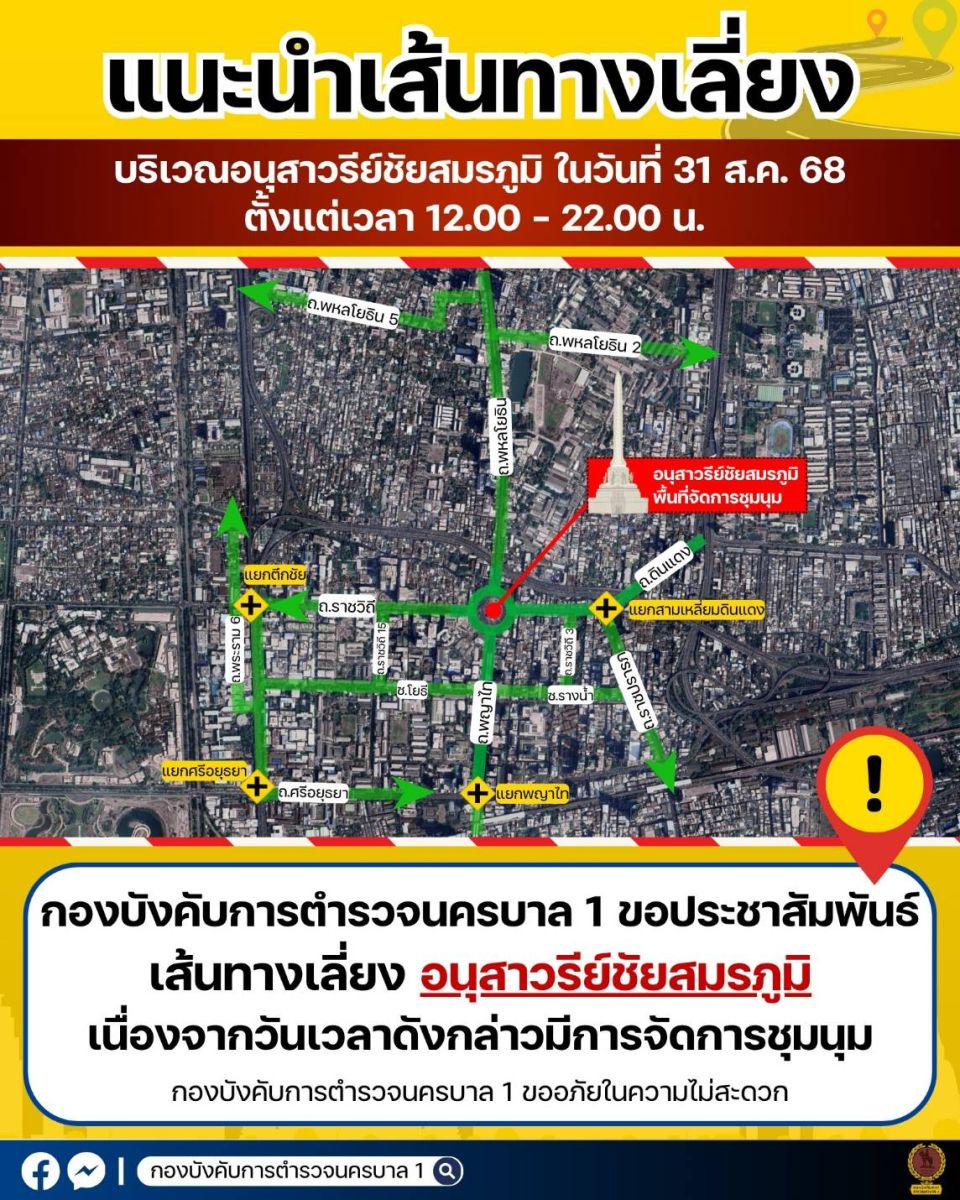 กองบัญชาการตำรวจนครบาล แจ้งประชาสัมพันธ์เส้นทางเลี่ยงบริเวณอนุสาวรีย์ชัยสมรภูมิ วันที่ 31 สิงหาคม 2568 ตั้งแต่เวลา 12.00 - 22.00 น.