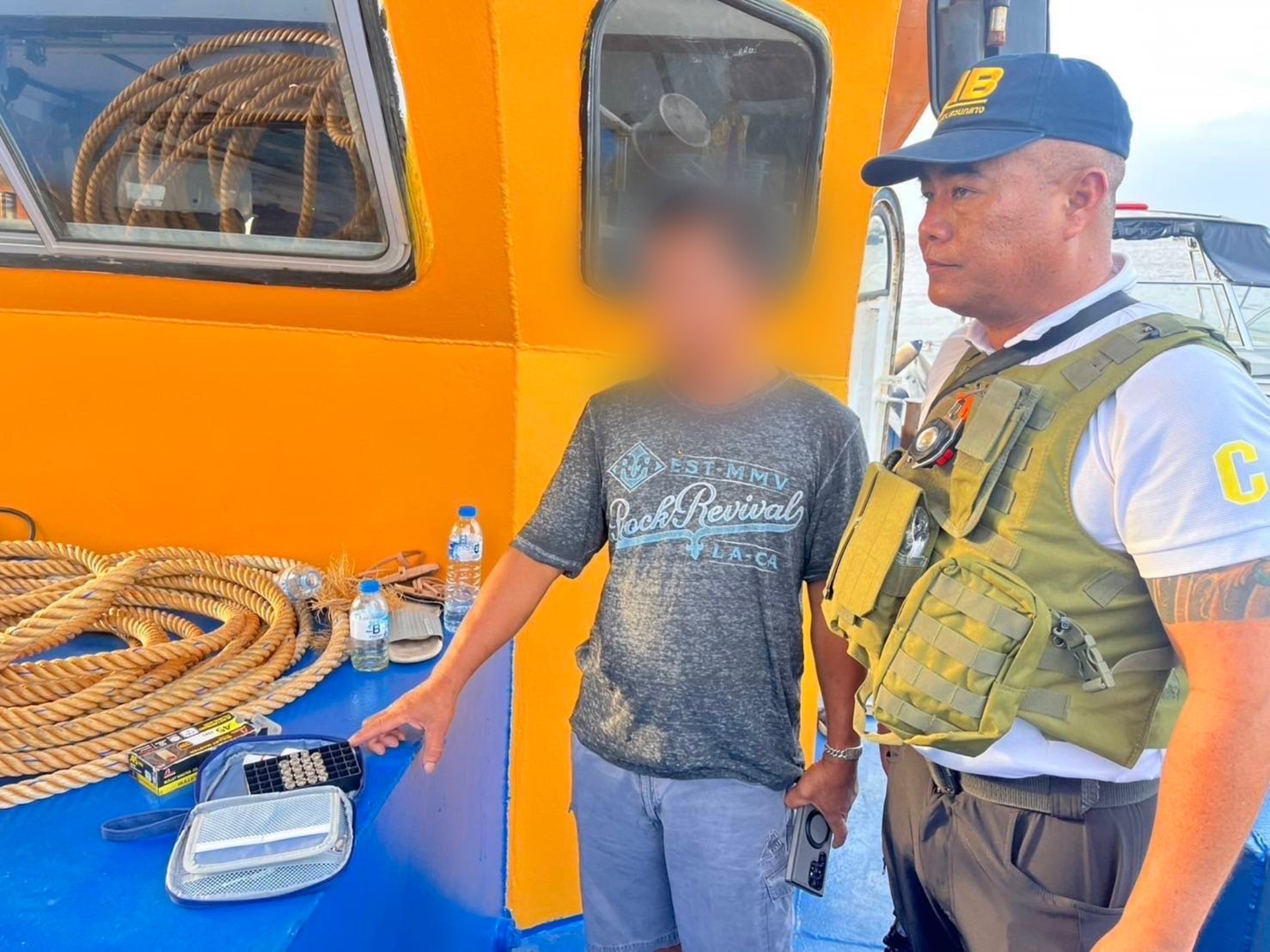 ต่อมา เจ้าหน้าที่ชุดจับกุมได้รับข้อมูลว่า นายสุ ได้เดินทางด้วยเรือ มาถึงบริเวณทุ่นเทียบเรือหน้าเกาะสีชัง จึงนำเรือตรวจการณ์ เข้าทำการตรวจสอบทันทีและจับกุมได้ โดยแต่งกายของนายสุสะดุดตา สวมสร้อยคอทองคำหลายเส้น แหวนทอง และสร้อยข้อมือทอง สอดคล้องกับข้อมูล ตรวจค้นบริเวณห้องเดินเรือ พบอาวุธปืนอีกด้วย