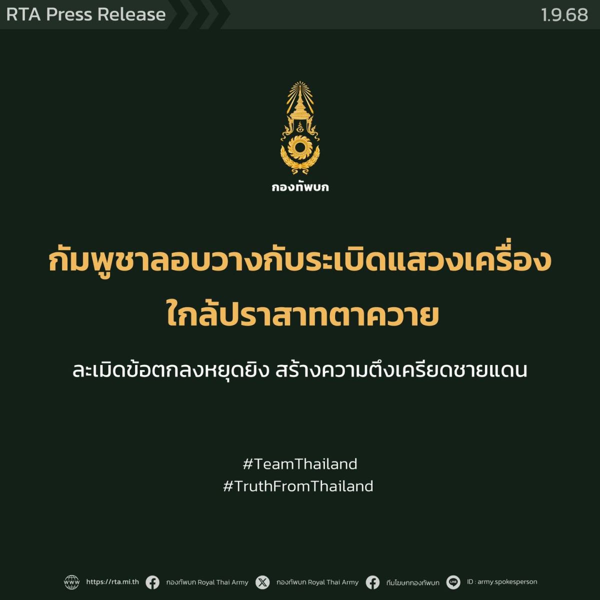 จ.สุรินทร์ ซึ่งต่อมา จากการเข้าตรวจสอบพื้นที่โดยรอบ พบการวางทุ่นระเบิด PMN-2 รวม 3 ทุ่น พร้อมลูกกระสุนเครื่องยิงลูกระเบิด 2 ลูก และตะปูเรือใบจำนวนมาก คาดว่าลูกกระสุนเครื่องยิงลูกระเบิดดังกล่าวจะถูกเตรียมนำมาใช้ในการวางกับระเบิดแสวงเครื่อง ตามที่ปรากฏจากกรณีดังกล่าว พลตรี วินธัย สุวารี โฆษกกองทัพบก กล่าวว่า การกระทำและหลักฐานดังกล่าวแสดงให้เห็นถึงการละเมิดข้อตกลงหยุดยิงอย่างชัดเจน ทั้งในเรื่องการใช้กับระเบิดแสวงเครื่อง เป็นอาวุธลอบโจมตีทหารไทยโดยหวังผลให้เกิดอันตรายถึงชีวิตในดินแดนของฝ่ายไทย ซึ่งถือเป็นการกระทำยั่วยุที่ส่งผลให้เกิดความตึงเครียดระหว่างกัน การกระทำดังกล่าวยังย้อนแย้งกับท่าทีที่ฝ่ายกัมพูชาพยายามบิดเบือนต่อประชาคมระหว่างประเทศว่าเป็นผู้รักสันติและยึดมั่นในข้อตกลงหยุดยิง ทั้งที่ข้อเท็จจริงและหลักฐานต่าง ๆ ที่พบ ยืนยันได้ว่ากัมพูชาละเมิดข้อตกลง รวมทั้งอนุสัญญาออตตาวามาโดยตลอด นอกจากนี้ โฆษกกองทัพบกยังได้กล่าวอีกว่า จากการที่ฝ่ายกัมพูชามีการใช้ยุทธวิธีวางทุ่นระเบิด เพื่อลอบทำร้ายฝ่ายไทยอย่างต่อเนื่อง พลเอก พนา แคล้วปลอดทุกข์ ผู้บัญชาการทหารบก ได้สั่งการผ่านกองทัพภาคที่ 2 กำชับให้กำลังพลทุกนายปฏิบัติหน้าที่ด้วยความรอบคอบ ไม่ประมาท และใช้ชุดทหารช่างเก็บกู้ทุ่นระเบิดเข้าตรวจสอบพื้นที่เสี่ยงเพื่อความปลอดภัยในการปฏิบัติภารกิจในทุกครั้ง