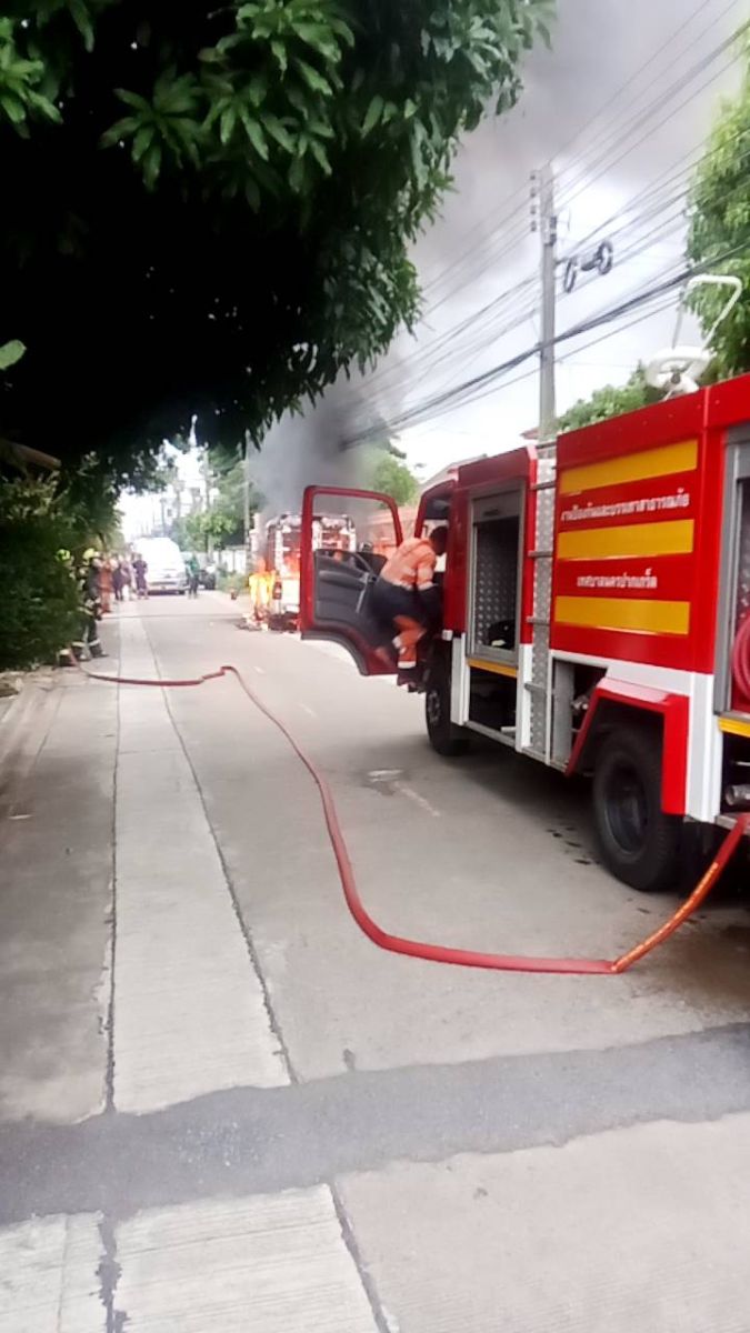 ที่เกิดเหตุพบว่าไฟกำลังลุกไหม้รถกระบะตู้ทึบ ยี่ห้อ โตโยต้า รถ่นรีโว่ สีขาว ทะเบียน กทม. รถดับเพลิง 2 คัน ใช้น้ำฉีดจนเพลิงสงบ และพบว่ารถเสียหายหมดทั้งคันและยังมีสายไฟและสายสื่อสารที่โดนเปลวเพลิงได้รับความเสียหายเล็กน้อย เจ้าหน้าที่การไฟฟ้าลงตรวจสอบ ส่วนคนขับคือ นายดี (นามสมมุติ) อายุ 29 ปี ได้รับบาดเจ็บมีบาดแผลถูกกระจกบาดที่ลำคอกู้ภัยปฐมพยาบาลเบื้องต้นก่อนนำตัวส่งโรงพยาบาลวิภารามปากเกร็ด