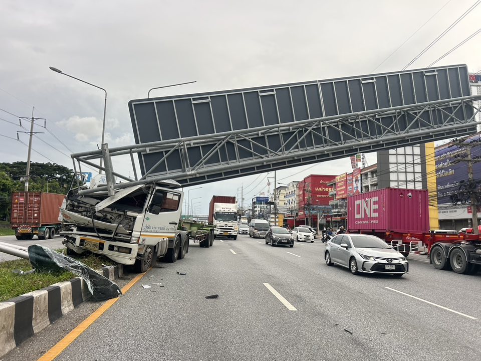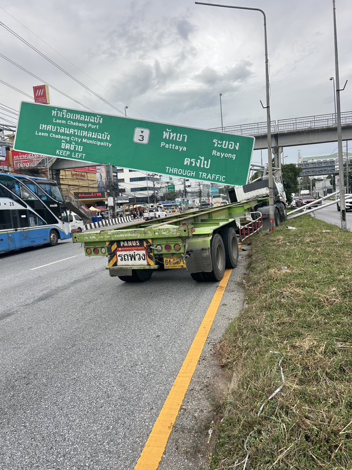 08.10 น. ถนนสุขุมวิท ขาออก บริเวณทะเลทองทาวเวอร์ ในพื้นที่ จ.ชลบุรี อุบัติเหตุ รถพ่วง 18 ล้อ เสียหลักพุ่งชนป้ายบอกทางหักลงมา กีดขวางช่องทางขวา รถติดมากทั้ง 2 ฝั่ง #รายงานจราจร #รถติด #อุบัติเหตุ #FM91