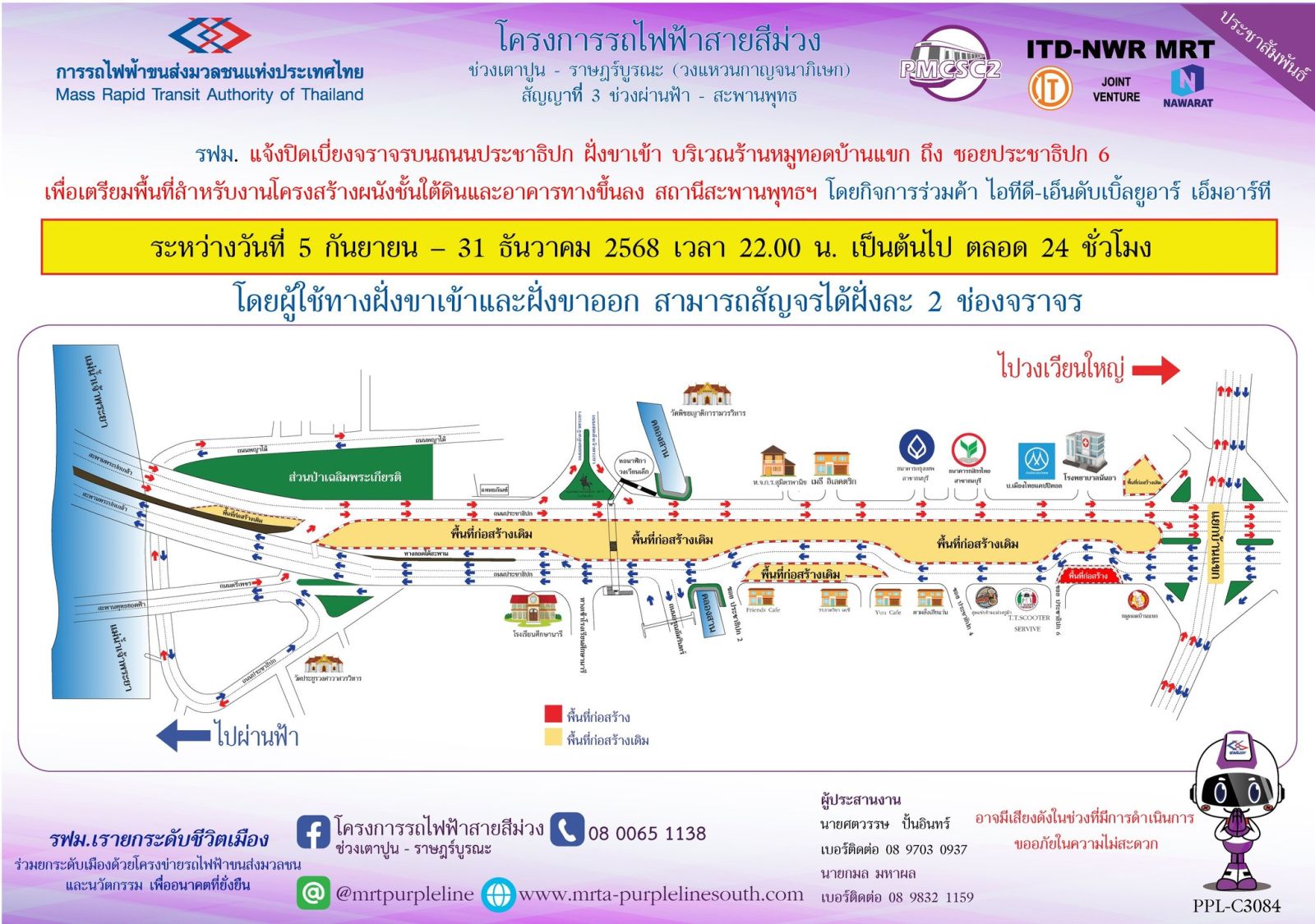 การรถไฟฟ้าขนส่งมวลชนแห่งประเทศไทย (รฟม.) แจ้งว่า กิจการร่วมค้า ไอทีดี-เอ็นดับเบิ้ลยูอาร์ เอ็มอาร์ที ผู้รับจ้างงานออกแบบและก่อสร้างอุโมงค์ทางวิ่งและสถานีใต้ดิน โครงการรถไฟฟ้าสายสีม่วง ช่วงเตาปูน - ราษฎร์บูรณะ (วงแหวนกาญจนาภิเษก) สัญญาที่ 3 ช่วงผ่านฟ้า - สะพานพุทธ มีความจำเป็นต้องปิดเบี่ยงจราจรบนถนนประชาธิปก ฝั่งขาเข้า บริเวณร้านหมูทอดบ้านแขก ถึง ซอยประชาธิปก 6 เพื่อเตรียมพื้นที่สำหรับงานโครงสร้างผนังชั้นใต้ดินและอาคารทางขึ้นลง สถานีสะพานพุทธฯ ระหว่างวันที่ 5 กันยายน - 31 ธันวาคม 2568 เวลา 22.00 น. เป็นต้นไป ตลอด 24 ชั่วโมง โดยผู้ใช้ทางฝั่งขาเข้าและฝั่งขาออก สามารถสัญจรได้ฝั่งละ 2 ช่องจราจร