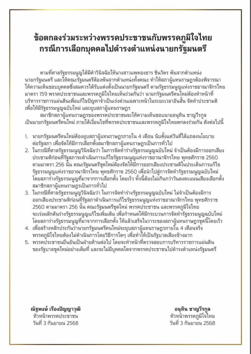 วันที่ 3 กันยายน 2568 ภายหลังจากที่พรรคประชาชนมีการประชุม สส. และกรรมการบริหารพรรค โดยมีวาระสำคัญ คือ การโหวตเลือกแคนดิเดตนายกรัฐมนตรีคนใหม่ ซึ่งก่อนหน้านี้ 2 พรรคการเมือง คือ พรรคเพื่อไทย และพรรคภูมิใจไทย ประกาศว่าพร้อมยอมรับเงื่อนไขที่พรรคประชาชนเสนอ เพื่อแลกกับเสียงโหวตสนับสนุนให้แคนดิเดตนายกรัฐมนตรีของพรรคการเมืองนั้นได้ดำรงตำแหน่ง