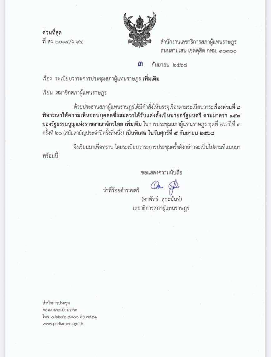 ด้วยประธานสภาผู้แทนราษฎร ได้มีคําสั่งให้บรรจุเรื่องตามระเบียบวาระ เรื่องด่วนที่ ๘ พิจารณาให้ความเห็นชอบบุคคล ซึ่งสมควรได้รับแต่งตั้งเป็นนายกรัฐมนตรี ตามมาตรา ๑๕๙ ของรัฐธรมนูญแห่งราชอาณาจักรไทย เพิ่มเติม ในการประชุมสภพผ้แทนราษฎร ชุดที่ ๒๖ ปีที่ ๓ ครั้งที่ ๒๐ (สมัยสามัญประจ๋าปีครั้งที่หนึ่ง) เป็นพิเศษ ในวันศุกร์ที่ ๕ กันยายน ๒๕๖๘