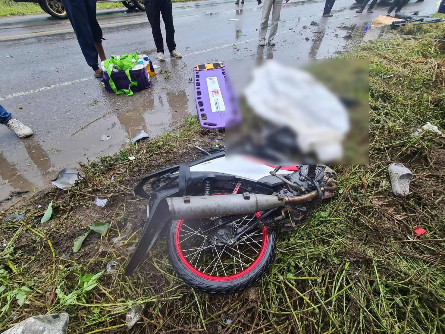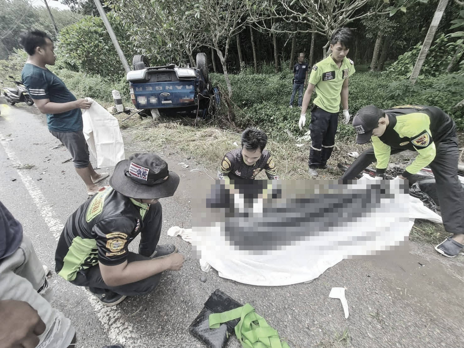 รถกระบะชนกับรถจักรยานยนต์ กลางถนนเส้นทางพระแสง - พุนพิน มีผู้เสียชีวิต 2 ราย จ.สุราษฎร์ธานี
