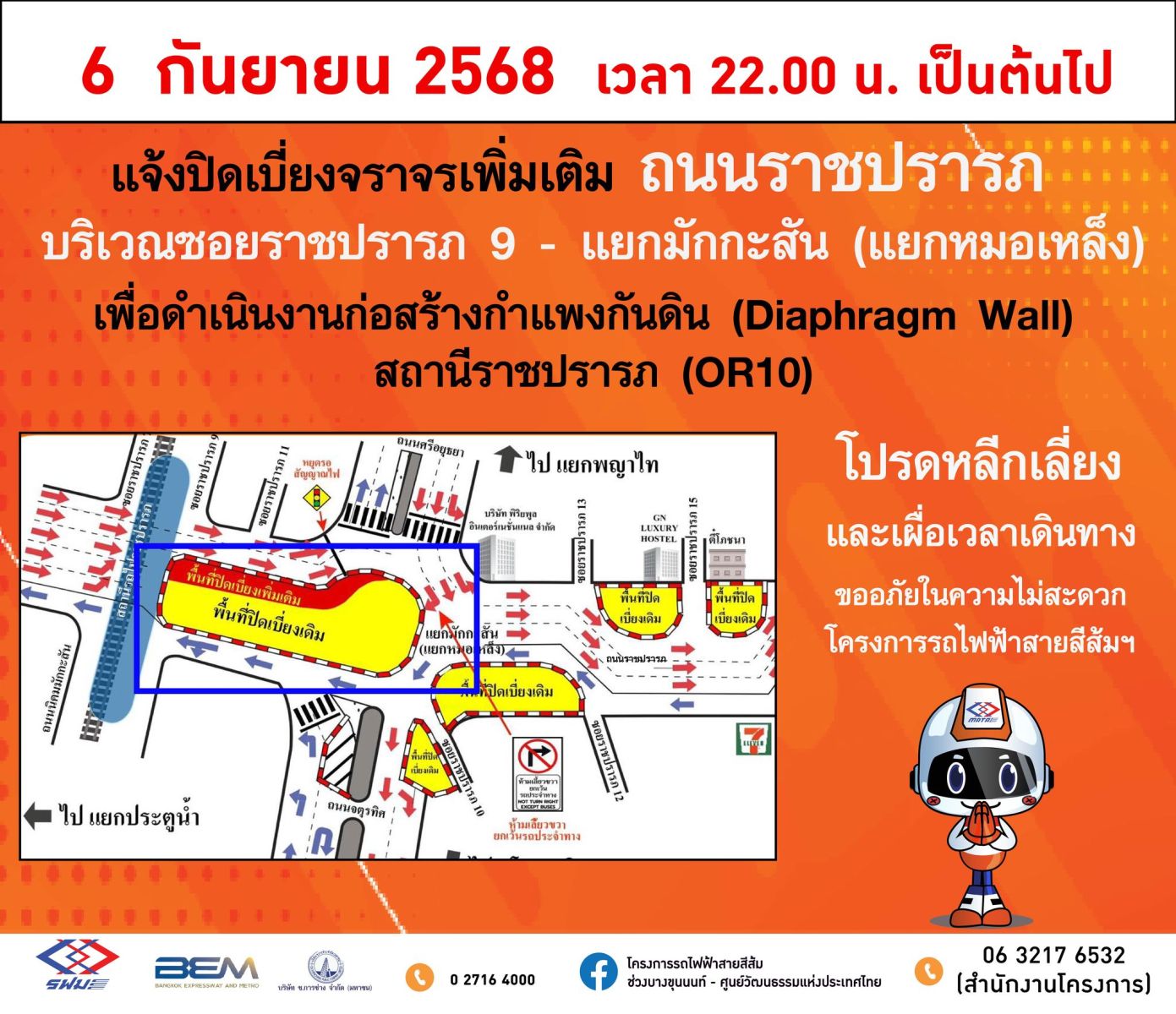 เน้นย้ำ ตั้งแต่วันที่ 6 กันยายน 2568 เวลา 22.00 น. เป็นต้นไป ปิดเบี่ยงจราจรเพิ่มเติม ถนนราชปรารภบริเวณ- ซอยราชปรารภ 9 – แยกมักกะสัน (หมอเหล็ง) เพื่อดำเนินงานก่อสร้างกำแพงกันดิน (Diaphragm Wall) สถานีราชปรารภ (OR10)
