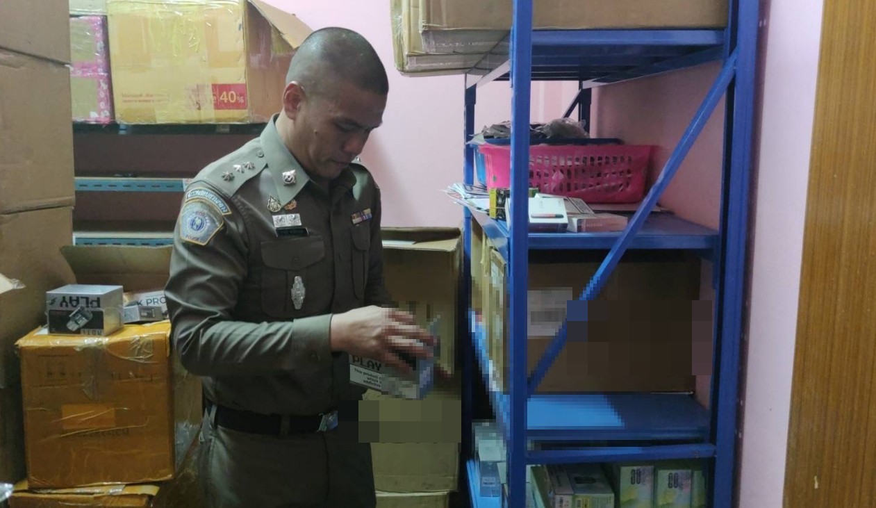 จากการเข้าตรวจค้นบ้านหลังดังกล่าว พบนางบอ(นามสมมุติ) ได้มาแสดงตนเป็นเจ้าของ/ผู้ให้เช่าบ้านหลังดังกล่าว เจ้าหน้าที่ตำรวจได้แสดงหมายค้น และพบว่าสถานที่ดังกล่าวเป็นพื้นที่ปิดมืด พบกล่องกระดาษวางเรียงกันอยู่เป็นจำนวนมาก เมื่อทำการตรวจสอบภายในกล่องพบบุหรี่ไฟฟ้า น้ำยาและส่วนควบบรรจุอยู่เป็นจำนวนมาก ซึ่งรวมถึงบุหรี่ไฟฟ้ารูปการ์ตูนซึ่งมีลักษณะคล้ายกับของเล่นเด็ก สามารถดึงดูดเยาวชนให้สนใจมาใช้ได้ ต่อมาเจ้าหน้าที่ตำรวจจึงได้นับจำนวนบุหรี่ไฟฟ้าที่พบทั้งหมดแล้วมีจำนวนหลายหมื่นชิ้น ตีเป็นมูลค่ากว่า 8 ล้านบาท พร้อมแจ้งข้อหา ก่อนที่จะขยายผลดำเนินคดีกับผู้ที่เกี่ยวข้องตามกฎหมาย