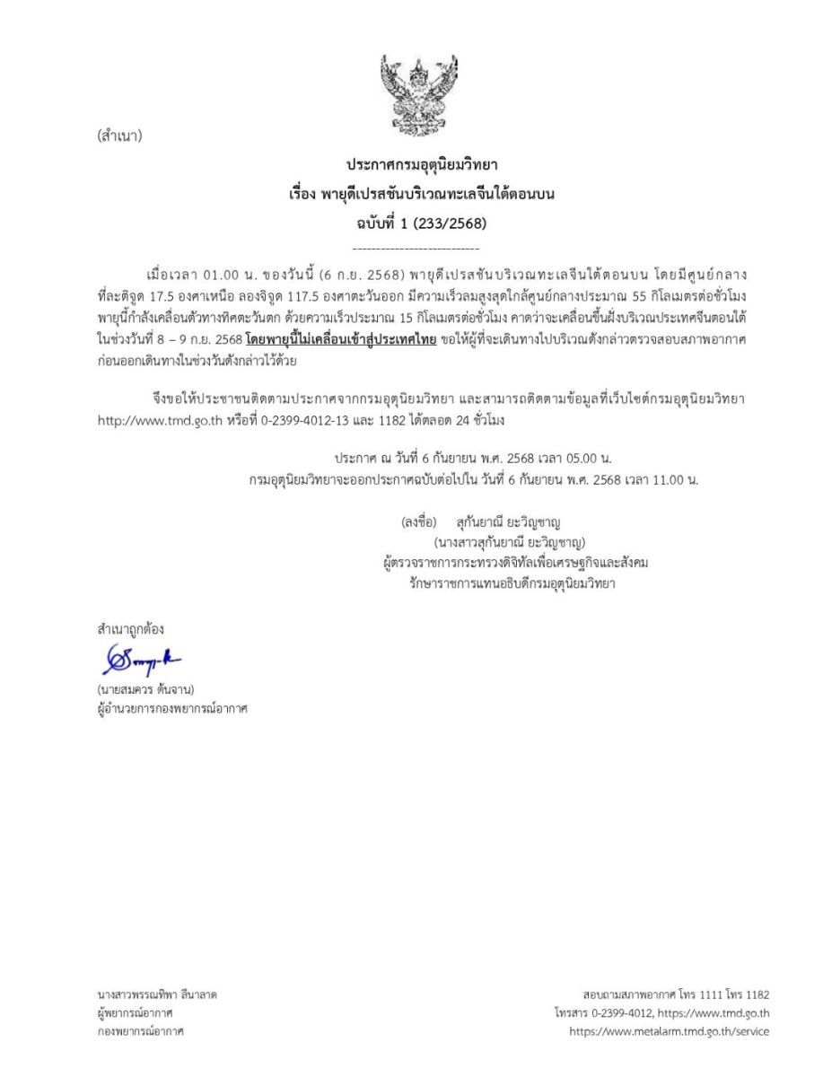 ประกาศ ณ วันที่ 6 กันยายน พ.ศ. 2568 เวลา 05.00 น.