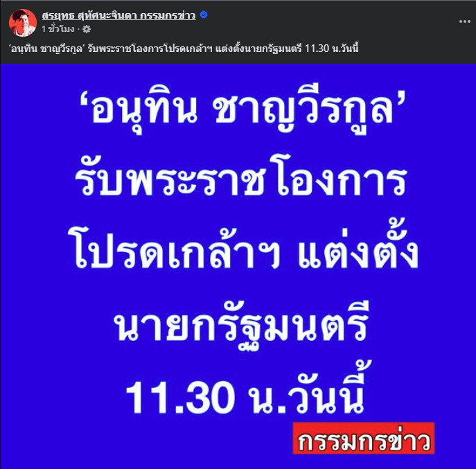 เมื่อเช้าวันอาทิตย์ที่ 7 กันยายน 2568 เพจเฟซบุ๊ก สรยุทธ สุทัศนะจินดา กรรมกรข่าว รายงานว่า วันนี้ เวลา 11:30 น. นายอนุทิน ชาญวีรกูล หัวหน้าพรรคภูมิใจไทย จะเข้ารับสนองพระบรมราชโองการโปรดเกล้าโปรดกระหม่อมแต่งตั้งให้ดำรงตำแหน่งนายกรัฐมนตรีคนที่ 32 ของประเทศไทย ณ ที่ทำการพรรคภูมิใจไทย นับเป็นการเข้าสู่ตำแหน่งผู้นำรัฐบาลอย่างเป็นทางการ