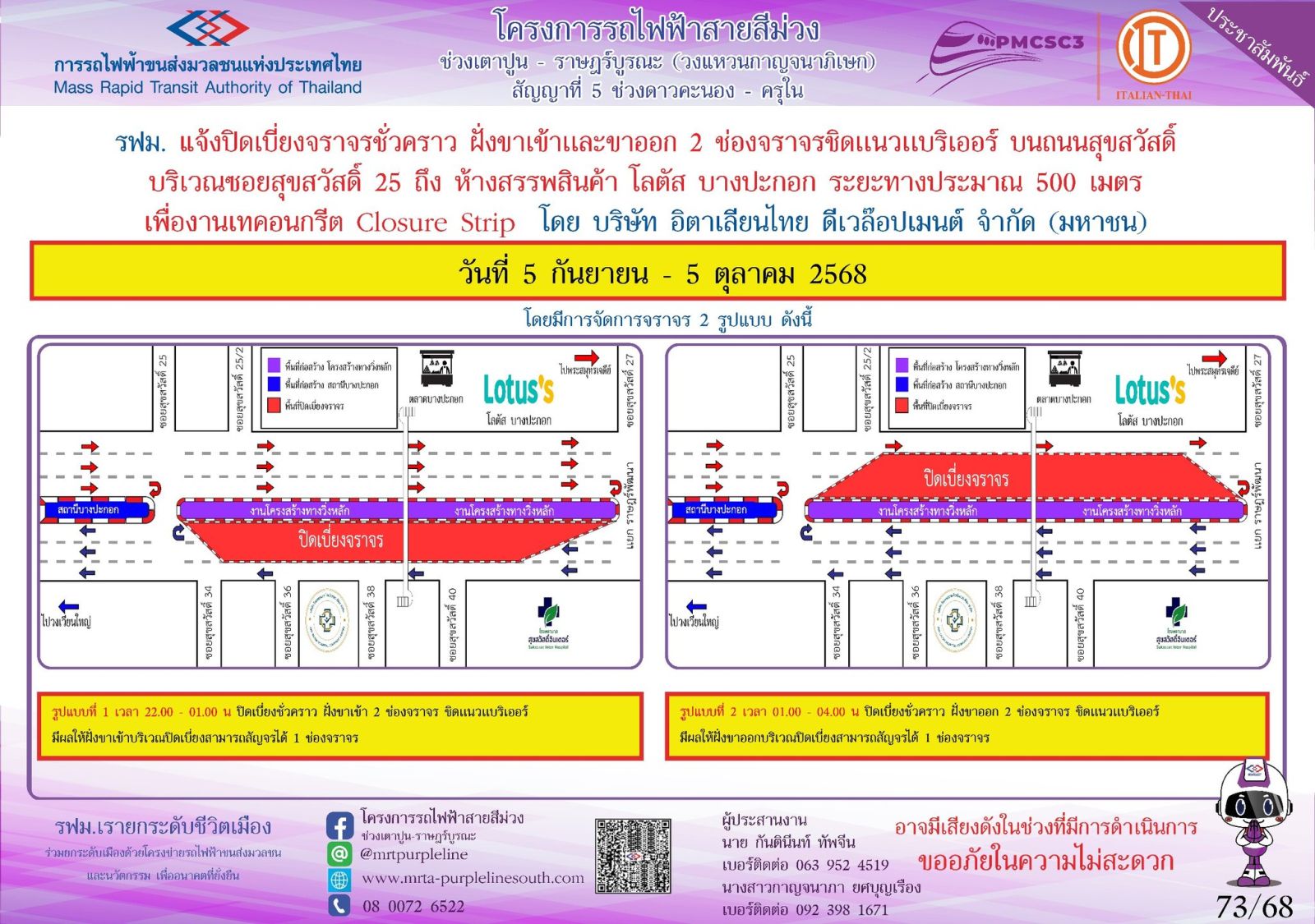 การรถไฟฟ้าขนส่งมวลชนแห่งประเทศไทย (รฟม.) แจ้งว่า บริษัท อิตาเลียนไทย ดีเวล๊อปเมนต์ จำกัด (มหาชน) ผู้รับจ้างงานก่อสร้างทางวิ่งและสถานียกระดับ อาคารจอดรถไฟฟ้าและอาคารจอดแล้วจร โครงการรถไฟฟ้าสายสีม่วง ช่วงเตาปูน - ราษฎร์บูรณะ (วงแหวนกาญจนาภิเษก) สัญญาที่ 5 ช่วงดาวคะนอง - ครุใน มีความจำเป็นต้องปิดเบี่ยงจราจรชั่วคราว ฝั่งขาเข้าและขาออก 2 ช่องจราจร ชิดแนวแบริเออร์ บนถนนสุขสวัสดิ์ บริเวณซอยสุขสวัสดิ์ 25 ถึง ห้างสรรพสินค้าโลตัส บางปะกอก ระยะทางประมาณ 500 เมตร เพื่อดำเนินงานเทคอนกรีต Closure Strip ระหว่างวันที่ 5 กันยายน - 5 ตุลาคม 2568 เฉพาะเวลา 22.00 - 04.00 น. โดยมีการจัดการจราจร 2 รูปแบบ ดังนี้