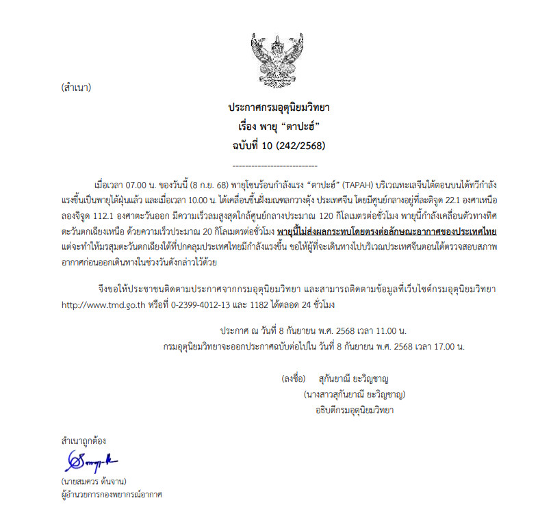 ประกาศกรมอุตุนิยมวิทยา เรื่อง พายุ “ตาปะฮ์” ฉบับที่ 10
