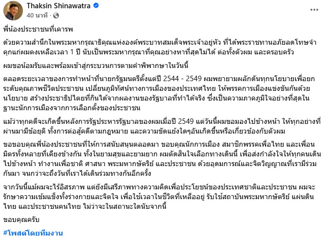 ‘ทักษิณ‘ สำนึกในพระมหากรุณาธิคุณพระราชทานอภัยลดโทษจำคุกเหลือ 1 ปี พร้อมเข้าสู่กระบวนการตามคำพิพากษา ขอบคุณประชาชน-สมาชิกพรรคเพื่อไทย เคียงข้างยามสุขและทุกข์ยาก บอก แม้ไร้อิสระแต่ยังมีเสรีภาพเพื่อประโยชน์ของชาติและประชาชน พร้อมทำตัวเองเข้มแข็งทั้งร่างกายจิตใจใช้ชีวิตที่เหลือรับใช้สถาบันและแผ่นดินไทย
