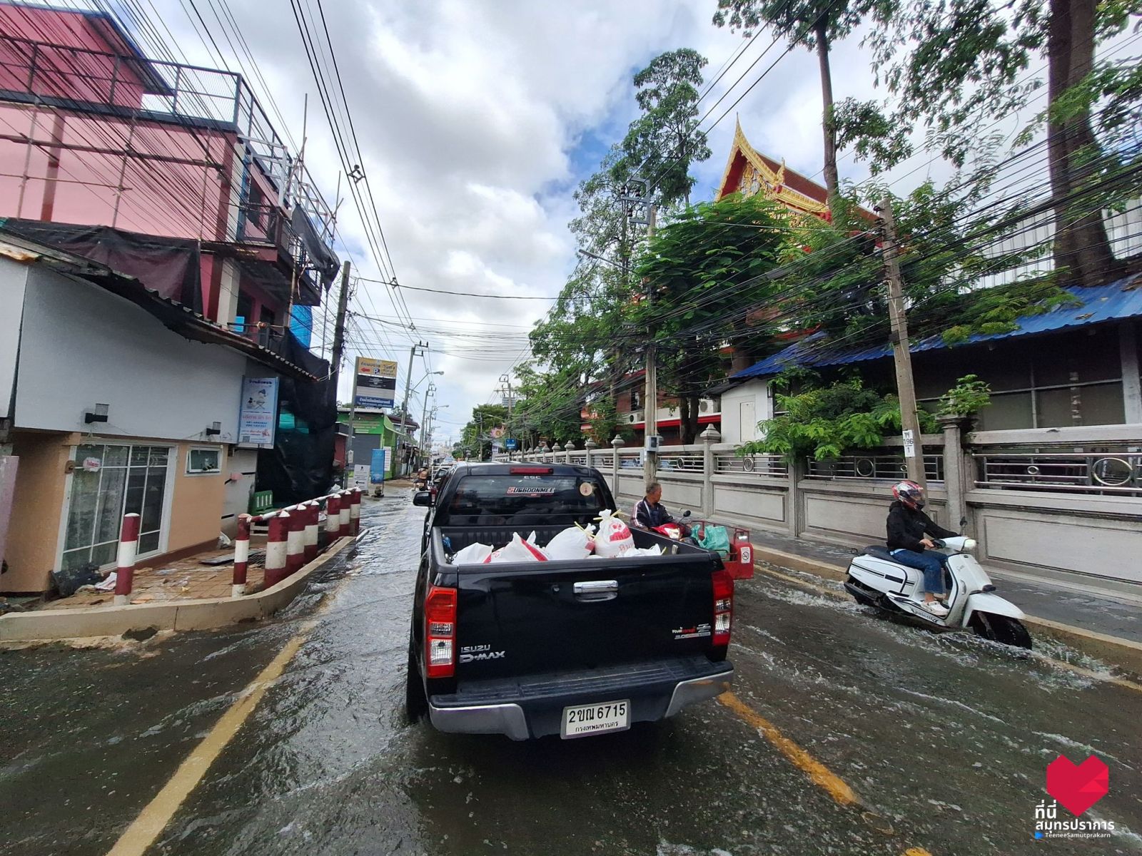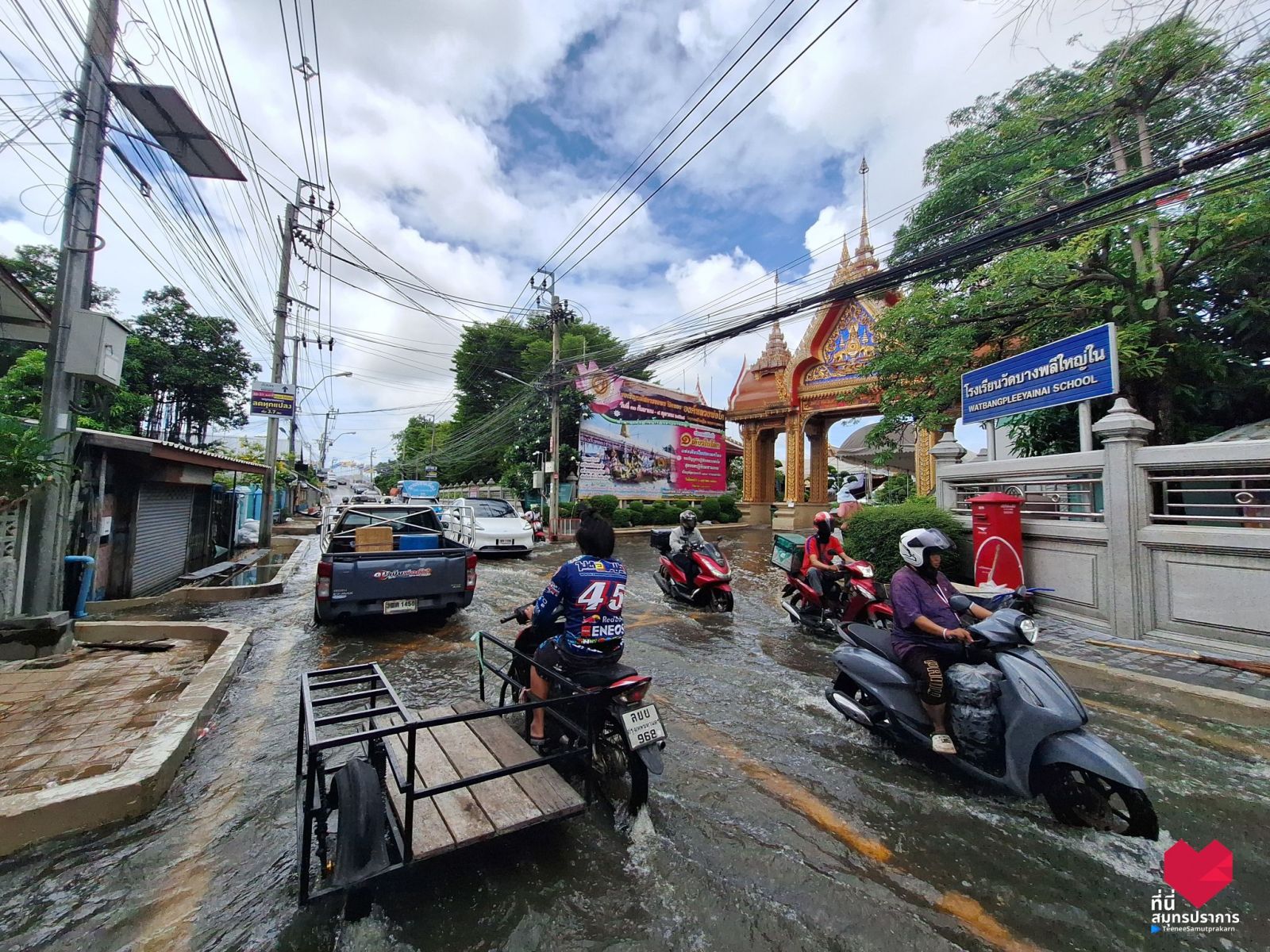 13.01 น. ซอยวัดหลวงพ่อโต จ.สมุทรปราการ ระดับน้ำยังไม่ลด ตามคลองน้ำปริ่มมาก ถ้าฝนตกลงมาซ้ำอีก ท่วมทันที เพราะของเก่ายังระบายไม่หมด #รายงานจราจร #ฝนตก #น้ำท่วม #สมุทรปราการ #FM91