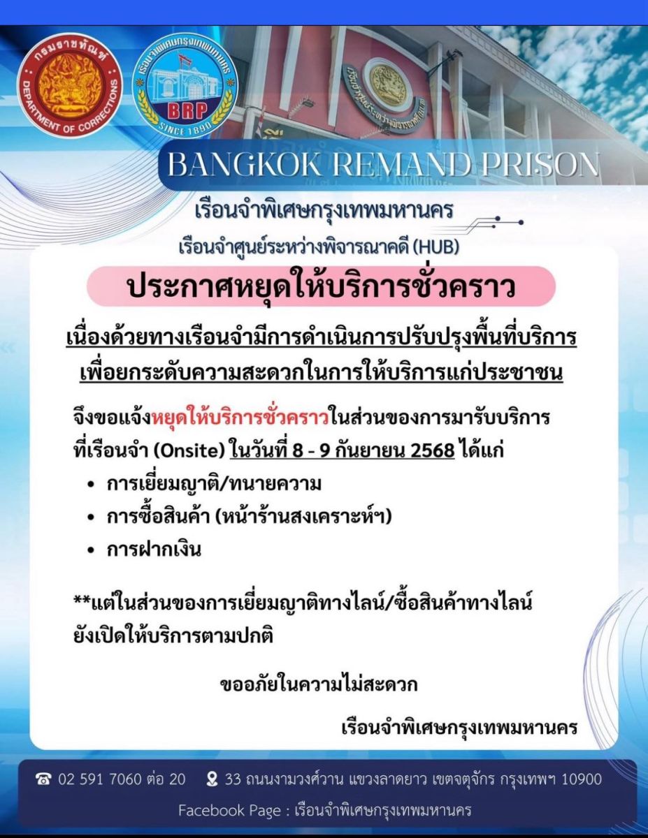 ขณะที่เพจ Facebook ชื่อ “เรือนจำพิเศษกรุงเทพมหานคร“ ซึ่งเป็นบัญชี Facebook สำหรับประชาสัมพันธ์งานเยี่ยมญาติของเรือนจำและกิจกรรมของเรือนจำ พบว่าเมื่อ 4 วันที่ผ่านมาทางเรือนจำฯ ได้โพสต์รูปภาพและข้อความระบุว่า “ประชาสัมพันธ์จากเรือนจำพิเศษกรุงเทพมหานคร” เรือนจำพิเศษกรุงเทพมหานคร เรือนจำศูนย์ระหว่างพิจารณาคดี (HUB) ประกาศหยุดให้บริการชั่วคราว เนื่องด้วยทางเรือนจำมีการดำเนินการปรับปรุงพื้นที่บริการ เพื่อยกระดับความสะดวกในการให้บริการแก่ประชาชน จึงขอแจ้งหยุดให้บริการชั่วคราวในส่วนของการมารับบริการที่เรือนจำ (Onsite) ในวันที่ 8-9 ก.ย.68 ได้แก่ การเยี่ยมญาติ/ทนายความ การซื้อสินค้า (หน้าร้านสงเคราะห์) การฝากเงิน แต่ในส่วนของการเยี่ยมญาติทางไลน์/ซื้อสินค้าทางไลน์ ยังเปิดให้บริการตามปกติ ขออภัยในความไม่สะดวก