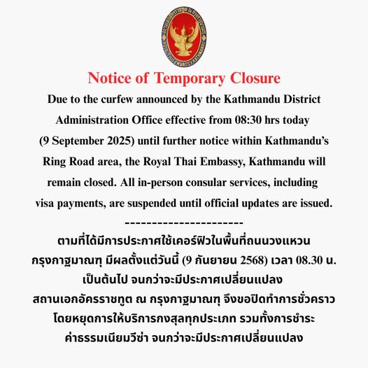ต่อมา สถานเอกอัครราชทูต ณ กรุงกาฐมาณฑุ โพสต์แจ้งว่า ตามที่ได้มีการประกาศใช้เคอร์ฟิว ในพื้นที่ถนนวงแหวนกรุงกาฐมาณฑุ มีผลตั้งแต่วันที่ 9 ก.ย.68 เวลา 8.30 น.เป็นต้นไป จนกว่าจะมีประกาศเปลี่ยนแปลง สถานเอกอัครราชทูต ณ กรุงกาฐมาณฑุ จึงขอปิดทำการชั่วคราว โดยหยุดให้บริการกงสุลทุกประเภท รวมทั้งการชำระค่าธรรมเนียมวีซ่า จนกว่าจะมีประกาศเปลี่ยนแปลง