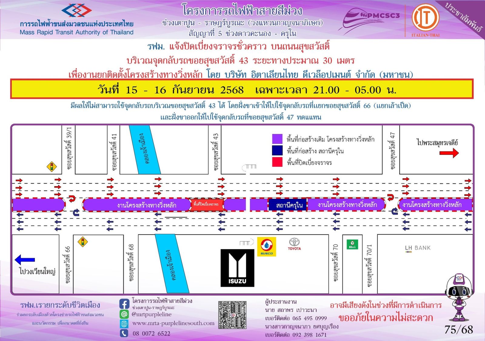 การรถไฟฟ้าขนส่งมวลชนแห่งประเทศไทย (รฟม.) แจ้งว่า บริษัท อิตาเลียนไทย ดีเวล๊อปเมนต์ จำกัด (มหาชน) ผู้รับจ้างงานก่อสร้างทางวิ่งและสถานียกระดับ อาคารจอดรถไฟฟ้าและอาคารจอดแล้วจร โครงการรถไฟฟ้าสายสีม่วง ช่วงเตาปูน - ราษฎร์บูรณะ (วงแหวนกาญจนาภิเษก) สัญญาที่ 5 ช่วงดาวคะนอง - ครุใน มีความจำเป็นต้องปิดเบี่ยงจราจรชั่วคราว บนถนนสุขสวัสดิ์ บริเวณจุดกลับรถซอยสุขสวัสดิ์ 43 ระยะทางประมาณ 30 เมตร เพื่องานยกติดตั้งโครงสร้างทางวิ่งหลัก ในวันที่ 15 - 16 กันยายน 2568 เฉพาะเวลา 21.00 - 05.00 น. โดยมีผลให้ไม่สามารถใช้จุดกลับรถบริเวณซอยสุขสวัสดิ์ 43 ได้ โดยฝั่งขาเข้าให้ไปใช้จุดกลับรถบริเวณแยกซอยสุขสวัสดิ์ 66 (แยกเล้าเป็ด) และฝั่งขาออกให้ไปใช้จุดกลับรถบริเวณซอยสุขสวัสดิ์ 47 ทดแทน