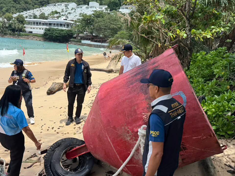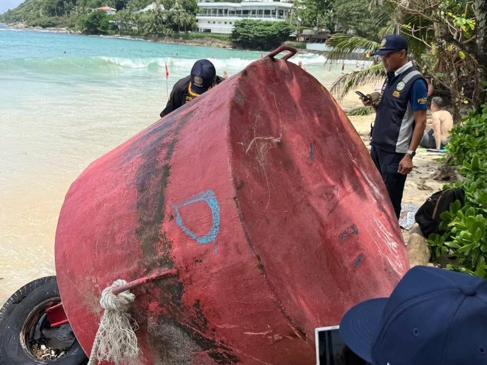 ตรวจสอบทุ่นขนาดใหญ่ หลังถูกคลื่นซัดมาเกยตื้น บริเวณหาดในหาน ยังไม่ทราบว่าลอยมาจากไหน และเป็นของหน่วยงานใด จ.ภูเก็ต