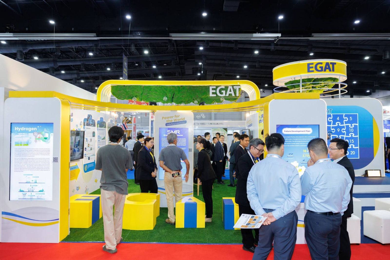 ภายในงานยังมีนิทรรศการภารกิจของ กฟผ. ในการเปลี่ยนผ่านพลังงาน และการมุ่งสู่เป้าหมายความเป็นกลางทางคาร์บอน ภายใต้แนวคิด “Power the Realistic Transition : Secure the World, Suitable for Everyone” “ขับเคลื่อนการเปลี่ยนแปลงอย่างแท้จริง : มั่นคงกับโลก เหมาะสมกับทุกคน” แบ่งออกเป็น 3 โซน ได้แก่ โซนที่ 1 : Advanced Technologies for Realistic Energy Transition เทคโนโลยีระบบผลิตไฟฟ้าพลังงานสะอาด มีบทบาทสำคัญในการลดการปล่อยก๊าซเรือนกระจก อาทิ โครงการโซลาร์เซลล์ลอยน้ำ ไฮโดรเจน และโรงไฟฟ้า SMR โซนที่ 2 : Stability through Realistic Energy Transition นวัตกรรมการสร้างเสถียรภาพและความมั่นคงให้ระบบไฟฟ้า รองรับความผันผวนของพลังงานหมุนเวียน สร้างความสมดุลทางพลังงานที่ยั่งยืน อาทิ การปรับปรุงและพัฒนาโครงข่ายไฟฟ้า โรงไฟฟ้าพลังน้ำแบบสูบกลับ และระบบกักเก็บพลังงานด้วยแบตเตอรี่ (BESS) โซนที่ 3 : Incentivizing Clean Energy Adoption through Social & Economic Mechanisms การใช้กลไกทางเศรษฐกิจและสังคมปรับเปลี่ยนพฤติกรรมทางสังคม สร้างแรงจูงใจในการสนับสนุนการใช้พลังงานสะอาดและลดการปล่อยคาร์บอนไดออกไซด์ อาทิ ระบบนิเวศยานยนต์ไฟฟ้า โครงการคาร์บอนเครดิต ตามกลไกโครงการลดก๊าซเรือนกระจกภาคสมัครใจ ตามมาตรฐานของประเทศไทย (T-VER) โครงการใบรับรองการผลิตไฟฟ้าพลังงานหมุนเวียน (REC)