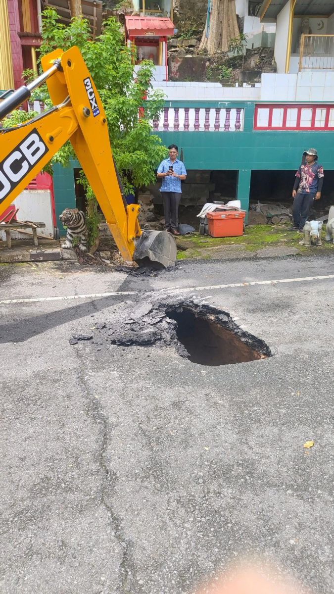 เทศบาลตำบลรัษฎา แก้ไขถนนทรุดตัวเป็นหลุมขนาดใหญ่ หน้าศาลาพ่อตาโต๊ะแซะ ทางขึ้นเขาโต๊ะแซะ แหล่งท่องเที่ยวชมลิง จ.ภูเก็ต