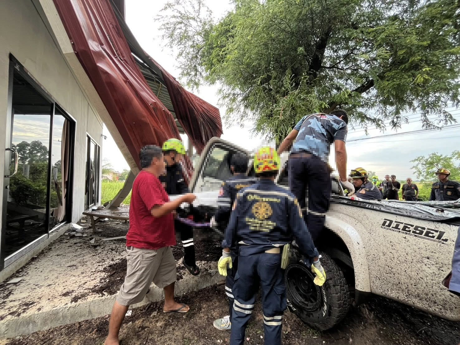 รถกระบะเสียหลักชนบ้านเรือนและฟาดเข้าต้นไม้ข้างทาง เพื่อนสาวนั่งเบาะหลังดับ ส่วนหนุ่มคนขับเจ็บสาหัส จ.ฉะเชิงเทรา