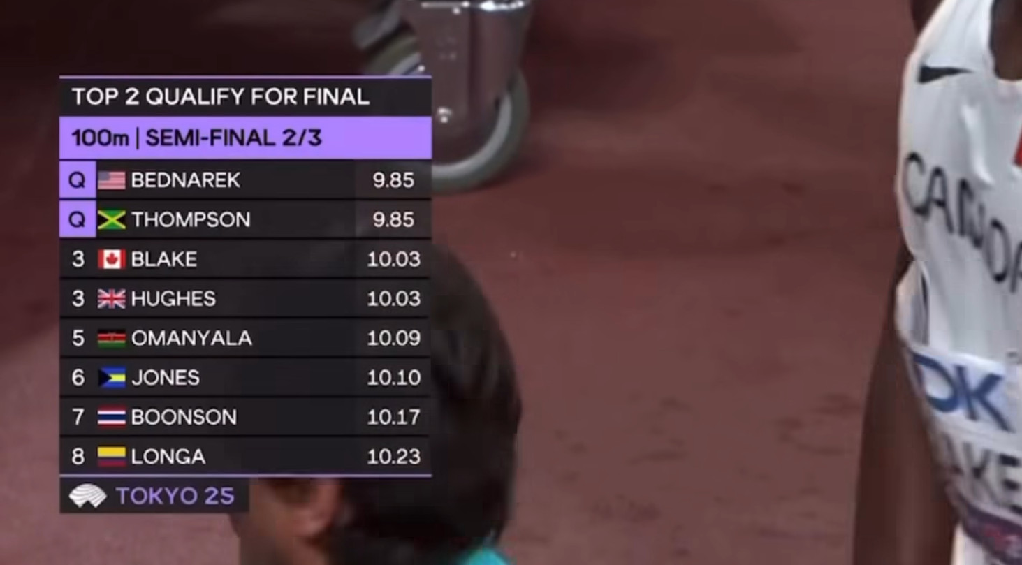 ขณะที่อันดับ 1 ของ Heat ที่ 2 เป็นเคนเน็ธ เบดนาเร็ก จากสหรัฐ และคีเชน ธอมป์สัน ของจาเมกา ซึ่งทำเวลาเท่ากันที่ 9.85 วินาที