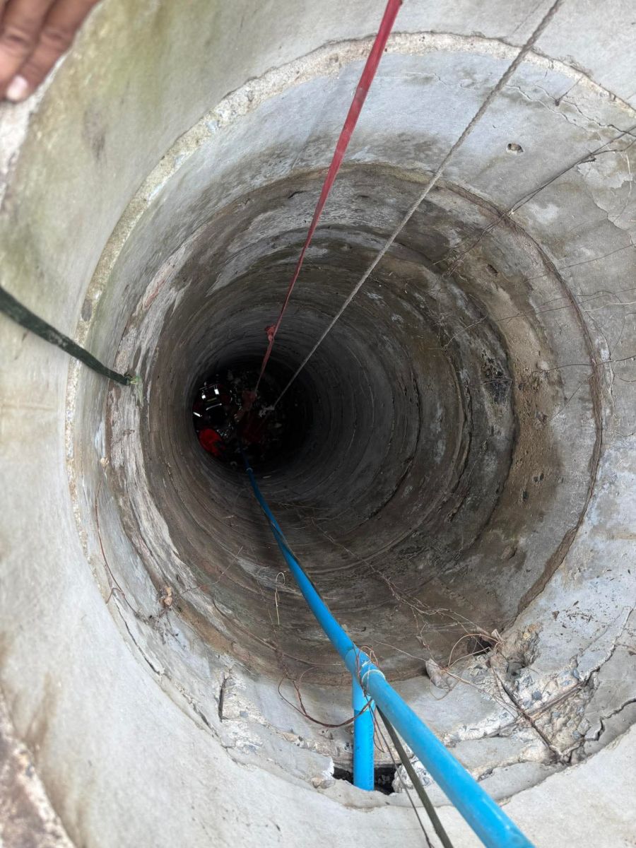 เจ้าหน้าที่ได้ตะโกนสอบถามถึงอาการ ทราบว่าหายใจไม่ออก เจ้าหน้าที่ได้นำพัดลมมาเปิดเป่าอากาศลงไปในบ่อ เพื่อป้องกันขาดอากาศหายใจ ก่อนใช้เชือกโรยตัวกู้ภัยฯ ช่วยเหลือ แต่ไม่สามารถช่วยใครได้ เนื่องจากมีความลึก ประกอบกับทั้ง 2 คน เริ่มอ่อนแรง อากาศน้อย จนต้องประเมินสถานการณ์ใหม่