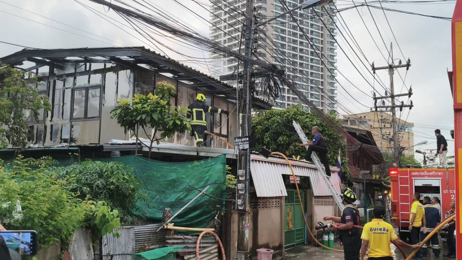 เพลิงไหม้บ้านเรือนประชาชน ชั้นบนเสียหายวอด พบเจ้าของบ้านจุดธูปขอพรบรรพบุรุษ ให้ญาติหายป่วย จ.ชลบุรี