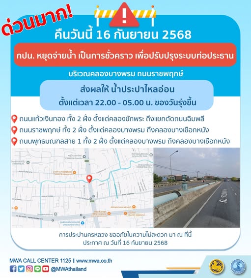 การประปานครหลวง (กปน.) ขอแจ้งให้ทราบว่า จะดำเนินการปรับปรุงระบบท่อประธาน ในพื้นที่บริเวณคลองบางพรม ถนนราชพฤกษ์ เพื่อให้ประชาชนได้รับบริการน้ำประปาอย่างเพียงพอและทั่วถึง จึงมีความจำเป็นต้องหยุดจ่ายน้ำ เป็นการชั่วคราว ในคืนวันนี้ (วันอังคารที่ 16 กันยายน 2568) ตั้งแต่เวลา 22.00 - 05.00 น. ของวันรุ่งขึ้น โดยระหว่างดำเนินการ ส่งผลให้ น้ำประปาไหลอ่อน ในพื้นที่ดังต่อไปนี้
