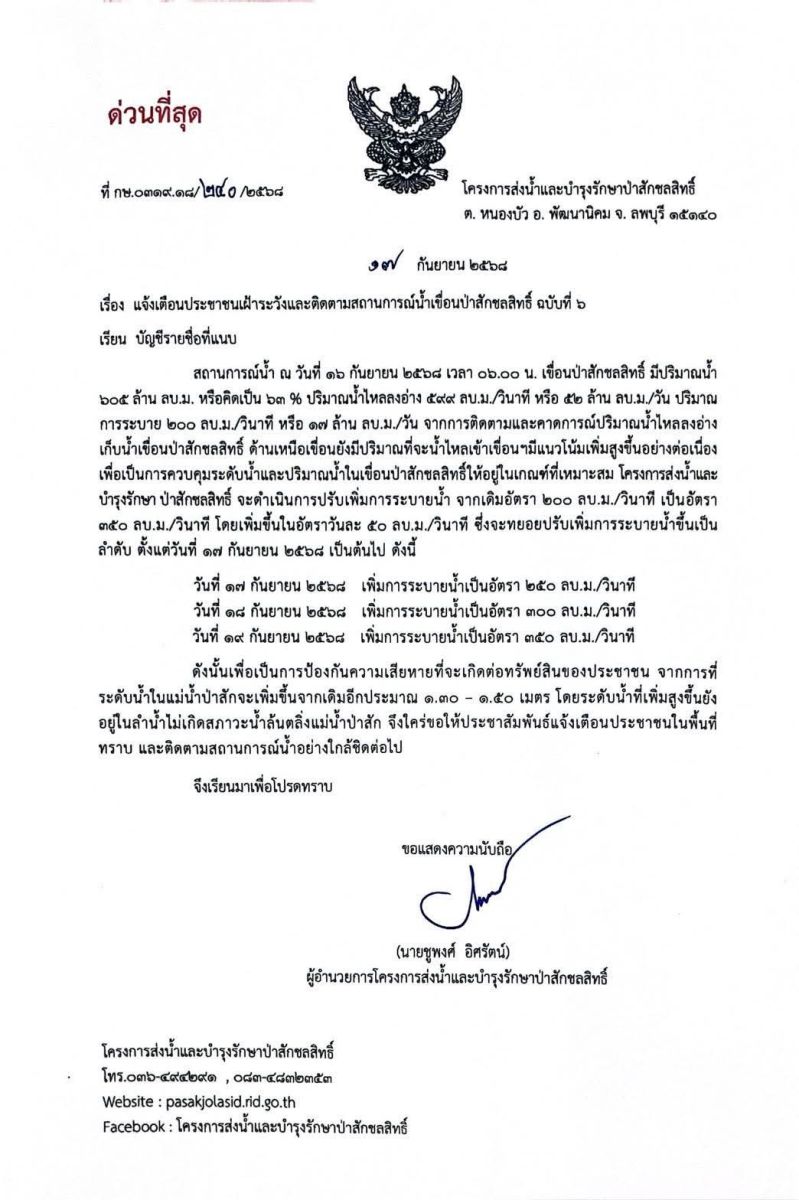 17 กันยายน 2568 ผู้สื่อข่าวรายงาน สถานการณ์น้ำ ณ วันที่ 16 กันยายน 2568 เวลา 06.00 น. เขื่อนป่าสักชลสิทธิ์ มีปริมาณน้ำ 605 ล้าน ลบ.ม. หรือคิดเป็น 63 % ปริมาณน้ำไหลลงอ่าง 599 ลบ.ม./วินาที หรือ 52 ล้าน ลบ.ม./วัน ปริมาณการระบาย 200 ลบ.ม./วินาที หรือ 17 ล้าน ลบ.ม./วัน จากการติดตามและคาดการณ์ปริมาณน้ำไหลลงอ่าง เก็บน้ำเขื่อนป่าสักชลสิทธิ์ ด้านเหนือเขื่อนยังมีปริมาณที่จะน้ำไหลเข้าเขื่อนฯ มีแนวโน้มเพิ่มสูงขึ้นอย่างต่อเนื่อง เพื่อเป็นการควบคุมระดับน้ำและปริมาณน้ำในเขื่อนป่าสักชลสิทธิ์ให้อยู่ในเกณฑ์ที่เหมาะสม โครงการส่งน้ำและบำรุงรักษาป่าสักชลสิทธิ์ จะดำเนินการปรับเพิ่มการระบายน้ำ จากเดิมอัตรา 200 ลบ.ม./วินาที เป็นอัตรา 350 ลบ.ม./วินาที โดยเพิ่มขึ้นในอัตราวันละ 50 ลบ.ม./วินาที ซึ่งจะทยอยปรับเพิ่มการ