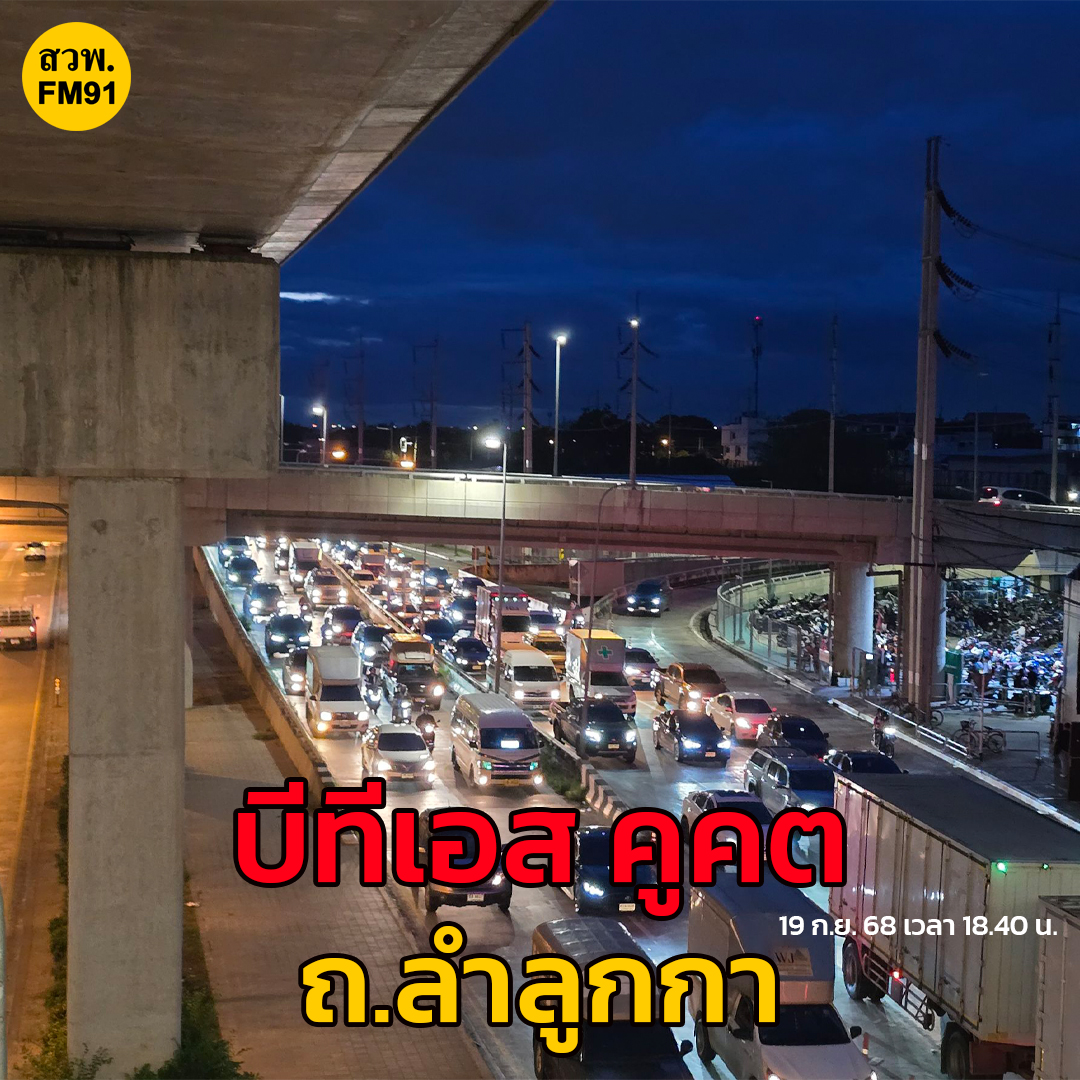19 ก.ย. 68 เวลา 18.40 น. ถ.ลำลูกกา ขาออก บีทีเอส คูคต แน่นไปถึงจุดกลับวัดสายไหม ท้ายสะสมถึงปากซอยลำลูกกา 25