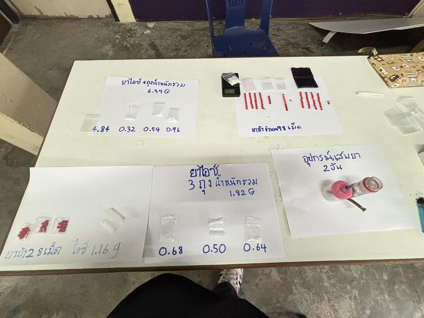 ที่เกิดเหตุเป็นตึกสูง 5 ชั้น เจ้าหน้าที่ได้กระจายกำลังตรวจสอบทุกห้องพัก โดยมีการเคาะประตูเรียกผู้พักอาศัยออกมาตรวจปัสสาวะ แล้วตรวจค้นภายในห้องอย่างละเอียด ผลการตรวจค้นพบ อุปกรณ์การเสพยาเสพติดหลายรายการ ถุงพลาสติกแบบซิป ที่ใช้บรรจุยาเสพติด อุปกรณ์การเสพ รวมถึงยาบ้าและยาไอซ์จำนวนหนึ่ง จากการตรวจสอบพบผู้พักอาศัยทั้งชายและหญิงจำนวนมากมีสารเสพติดในร่างกายกว่า 30 คน นอกจากนี้ยังพบผู้ต้องหามียาเสพติดไว้ในครอบครองเพื่อจำหน่าย