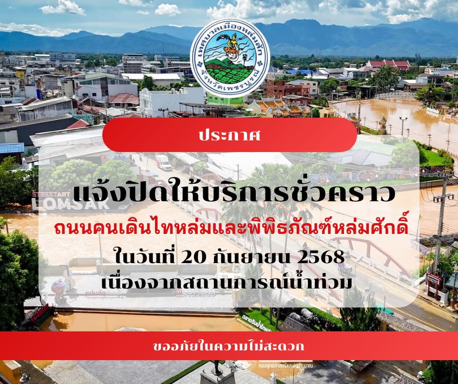 พร้อมมีการ ประกาศ แจ้งปิดให้บริการชั่วคราว “ถนนคนเดินไทหล่มและพิพิธภัณฑ์หล่มศักดิ์” ในวันเสาร์ที่ 20 กันยายน 2568 เป็นการชั่วคราว เนื่องจากสถานการณ์น้ำท่วม ขออภัยในความไม่สะดวก