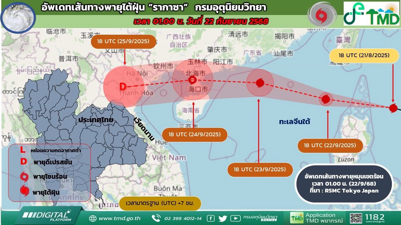 พายุไต้ฝุ่น “รากาซา” (RAGASA) บริเวณด้านตะวันออกของประเทศฟิลิปปินส์ มีแนวโน้มจะเคลื่อนลงสู่ทะเลจีนใต้ในวันนี้ (22 ก.ย. 68) และคาดว่า ในช่วงวันที่ 25 – 26 ก.ย. 68 จะเคลื่อนตัวลงสู่อ่าวตังเกี๋ย และขึ้นฝั่งบริเวณประเทศเวียดนามตอนบน หลังจากนั้นจะอ่อนกำลังตามลำดับ