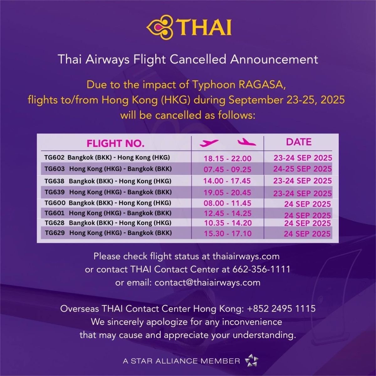 Thai Airways International Public Company Limited (THAI) announces the cancellation of flights between Bangkok and Hong Kong due to the impact from Typhoon “RAGASA,” as follows: