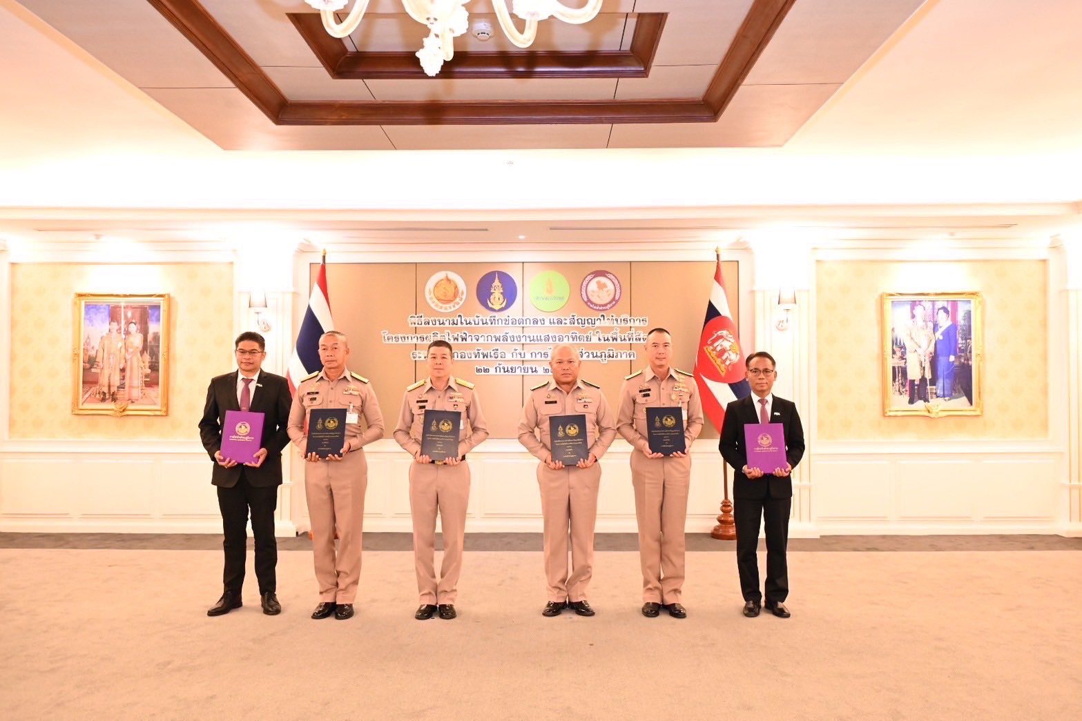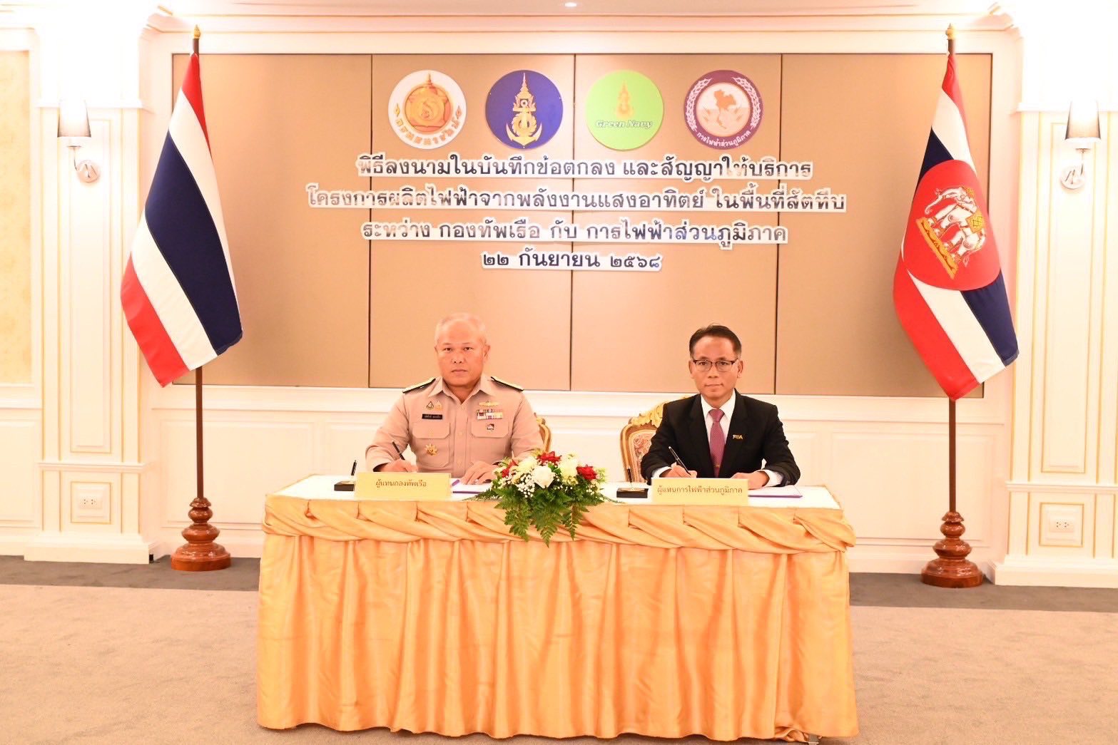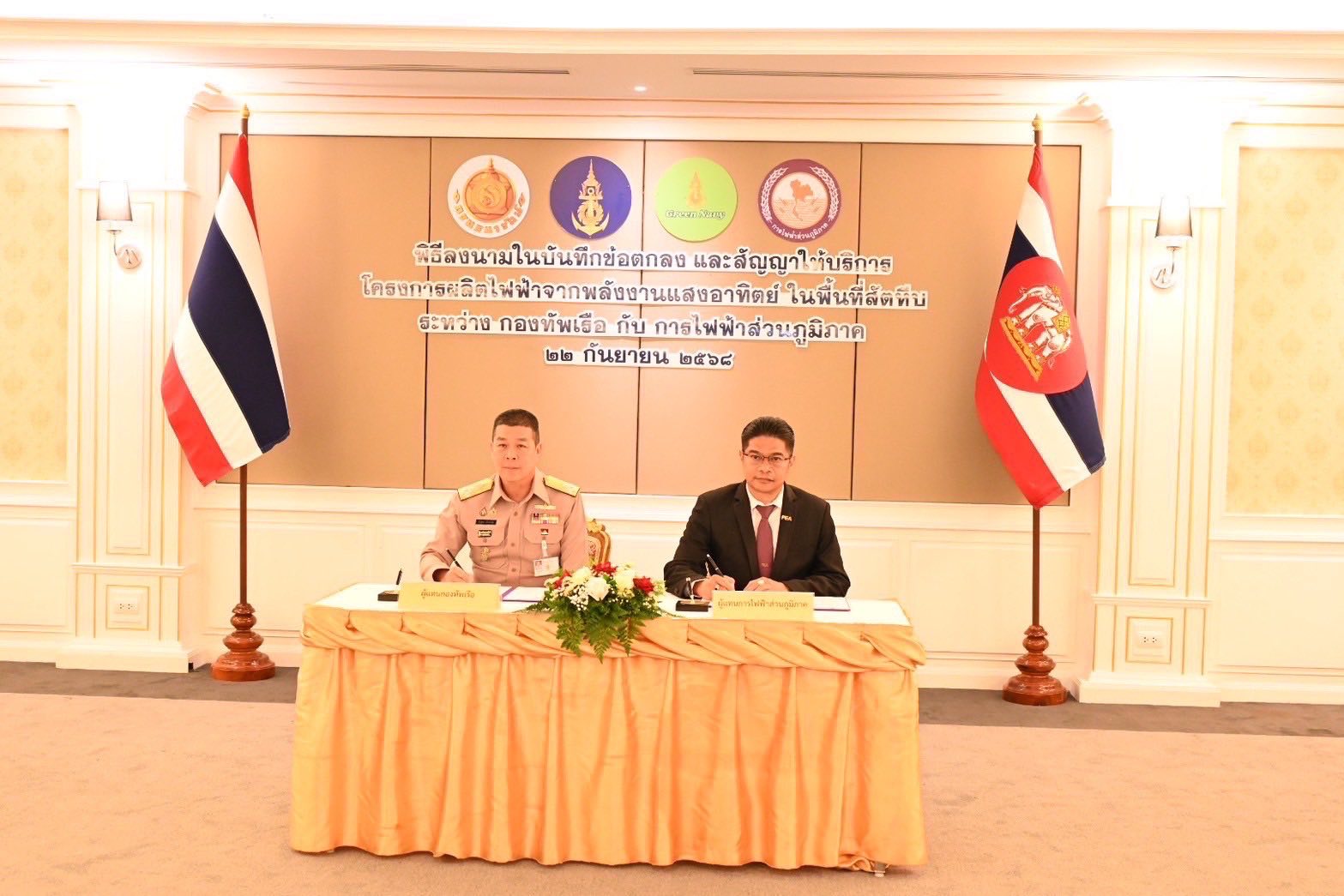 วันที่ 22 กันยายน 2568 นายมงคล ตรีกิจจานนท์ ผู้ว่าการการไฟฟ้าส่วนภูมิภาค (PEA) พลเรือเอก จิรพล ว่องวิทย์ ผู้บัญชาการทหารเรือ ร่วมเป็นเกียรติในพิธีลงนามในบันทึกข้อตกลงความร่วมมือและสัญญาให้บริการ โครงการจัดการพลังงานไฟฟ้าจากระบบผลิตไฟฟ้าพลังงานแสงอาทิตย์ที่ติดตั้งแบบลอยน้ำ (Floating Solar) และแบบติดตั้งบนพื้นดิน (Solar Farm) ภายในหน่วยงานของกองทัพเรือ พื้นที่สัตหีบ จำนวน 6 พื้นที่ ณ ห้องรับรอง ชั้น 2 อาคารกองบัญชาการกองทัพเรือ