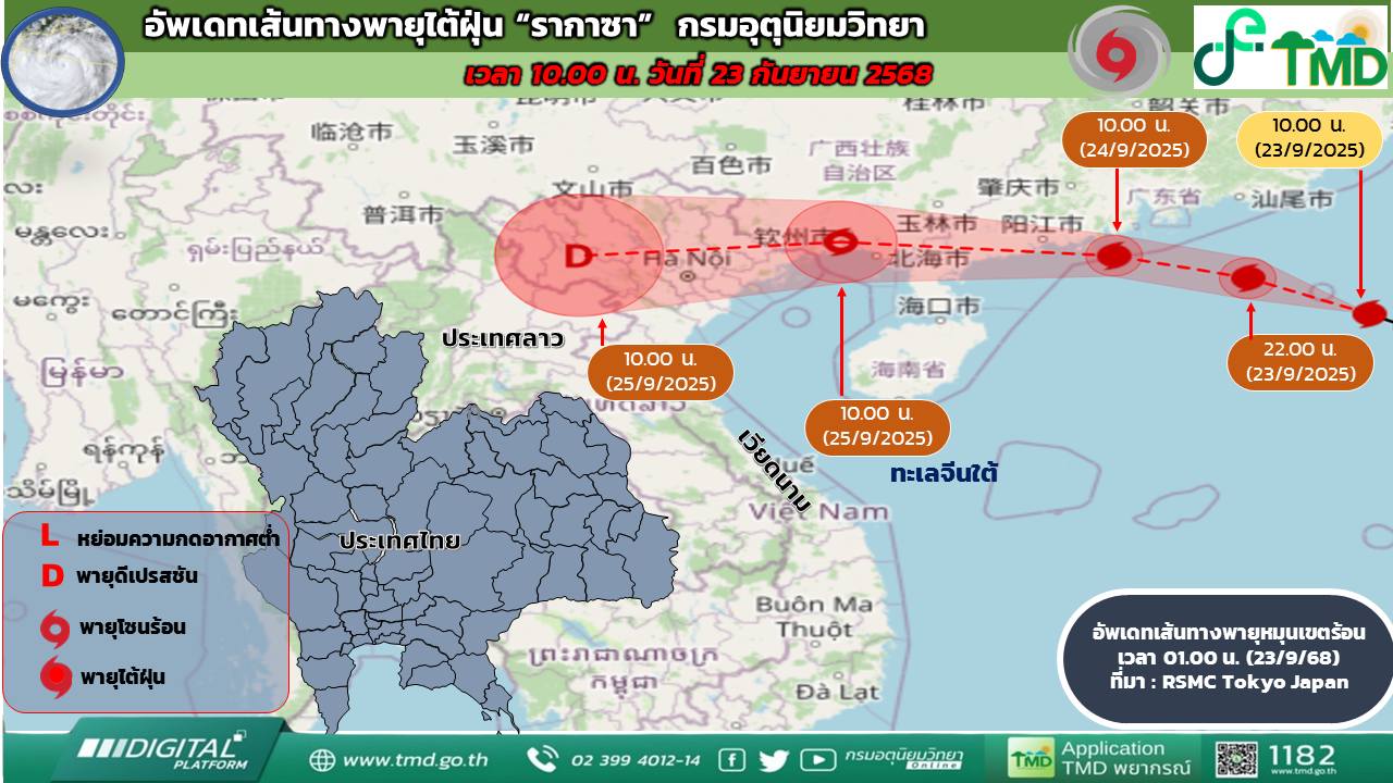 เมื่อเวลา 16.00 น. ของวันนี้ (23 ก.ย. 68) พายุไต้ฝุ่น “รากาซา” บริเวณทะเลจีนใต้ตอนบน มีศูนย์กลางอยู่ที่ละติจูด 20.6 องศาเหนือ ลองจิจูด 116.6 องศาตะวันออก ความเร็วลมสูงสุดใกล้ศูนย์กลางประมาณ 195 กิโลเมตรต่อชั่วโมง พายุนี้กำลังเคลื่อนตัวทางทิศตะวันตกค่อนทางเหนือเล็กน้อย ด้วยความเร็วประมาณ 20 กิโลเมตรต่อชั่วโมง คาดว่าจะเคลื่อนเข้าใกล้เกาะฮ่องกง และเคลื่อนผ่านแนวชายฝั่งทางตอนใต้ของประเทศจีน ลงสู่อ่าวตังเกี๋ยในวันที่ 25 ก.ย. 68 และจะอ่อนกำลังลงเป็นพายุโซนร้อนก่อนเคลื่อนขึ้นฝั่งประเทศเวียดนามตอนบน จากนั้นมีแนวโน้มจะอ่อนกำลังลงอย่างรวดเร็ว เนื่องจากมีมวลอากาศเย็นจากประเทศจีนแผ่เสริมลงมาปกคลุม ในช่วงวันที่ 25–26 ก.ย. 68 โดยพายุนี้ไม่เคลื่อนเข้าสู่ประเทศไทย
