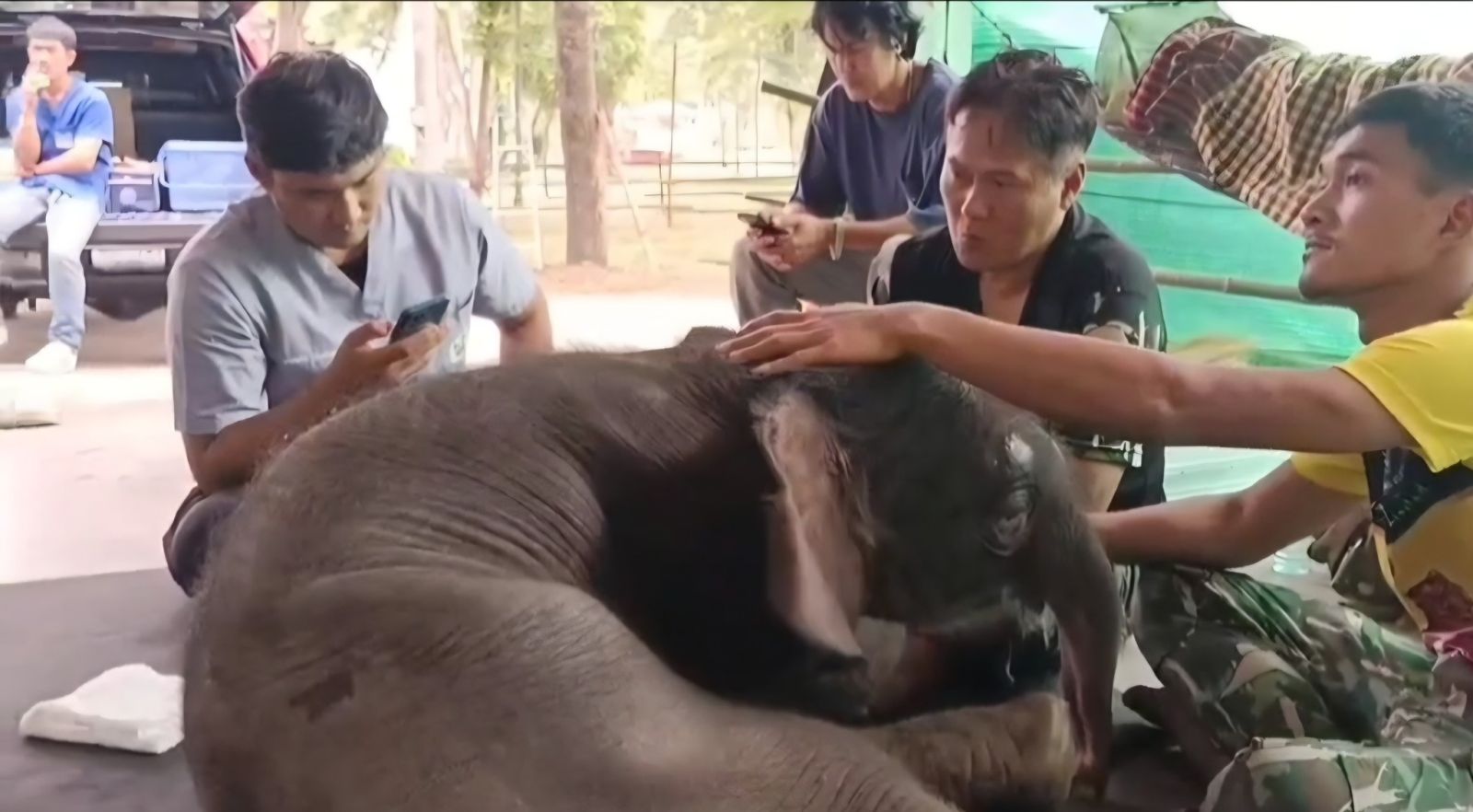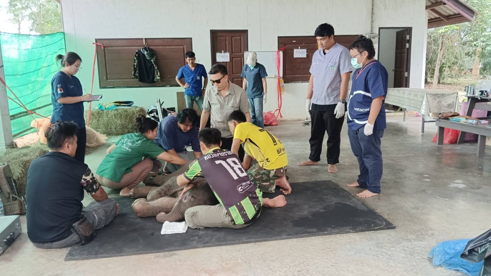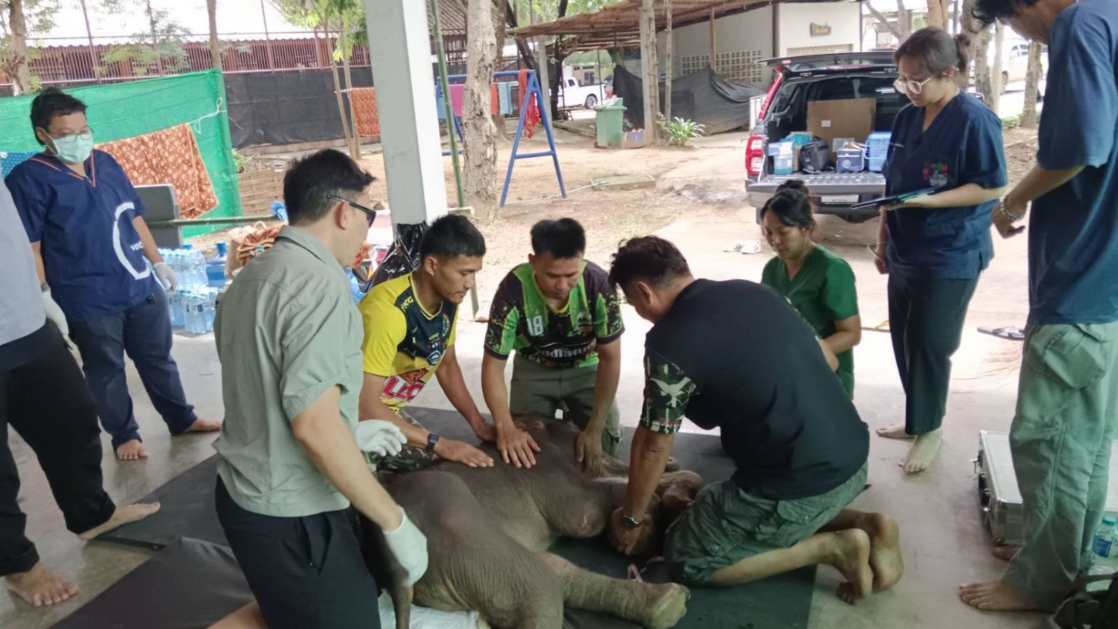 ทีมสัตวแพทย์ที่เข้าร่วมการดูแลและวินิจฉัยอาการของ “พังข้าวต้ม” ประกอบด้วยน.สพ.ภัทรพล มณีอ่อน หัวหน้ากลุ่มงานจัดการสุขภาพสัตว์ป่า สำนักอนุรักษ์สัตว์ป่า, สพ.ญ.ลักษณา ประสิทธิชัย นายสัตวแพทย์ชำนาญการพิเศษ, สพ.ญ.กานต์พิชชา หาญอาษา นายสัตวแพทย์ปฏิบัติการ สำนักบริหารพื้นที่อนุรักษ์ที่ 3 (บ้านโป่ง) สพ.ญ.ณฐนน ปานเพ็ชร นายสัตวแพทย์ชำนาญการ หัวหน้าเขตห้ามล่าสัตว์ป่าบึงฉวาก และศูนย์พัฒนาการจัดการสัตว์ป่าบึงฉวาก, ผศ.สพ.ญ.ดร.สุภาเพ็ญ ศรีพิบูลย์ คณะสัตวแพทยศาสตร์ มหาวิทยาลัยเกษตรศาสตร์ วิทยาเขตกำแพงแสน และสพ.ญ.สุธีรานันท์ พิพิธวนิชธรรม คณะสัตวแพทยศาสตร์ มหาวิทยาลัยเกษตรศาสตร์ วิทยาเขตกำแพงแสน