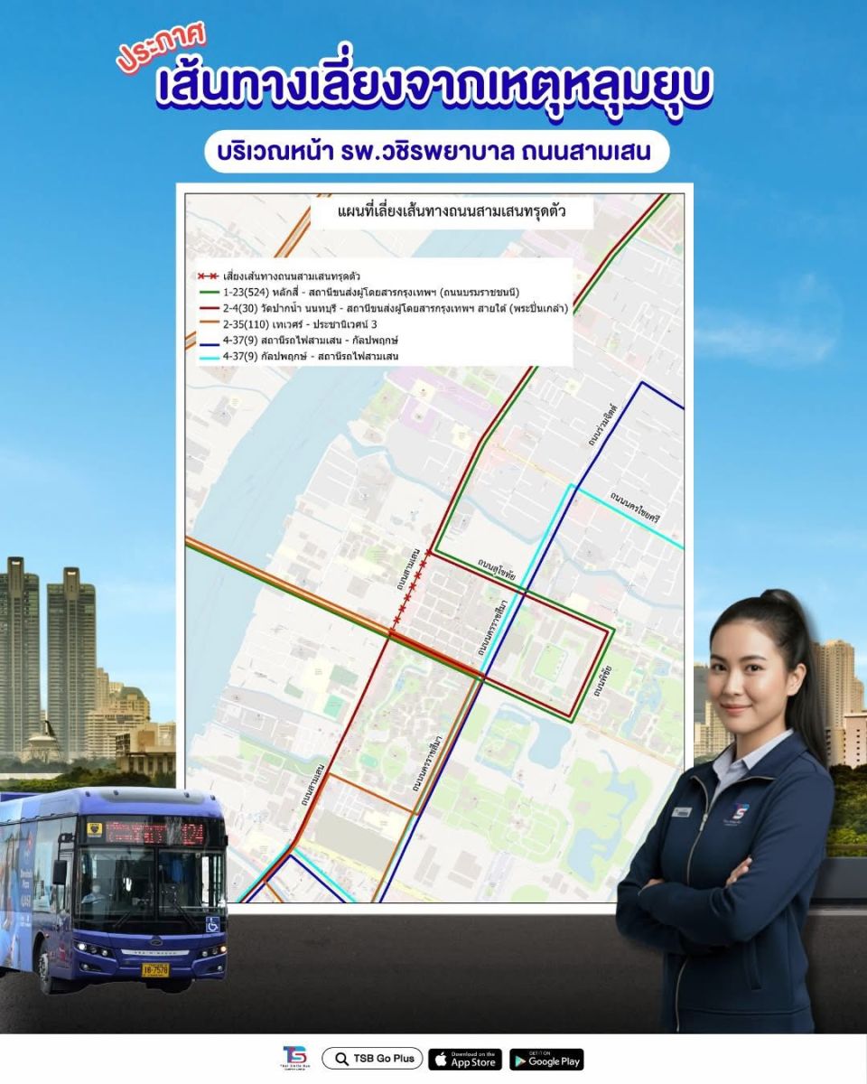 รถเมล์ไทย สมายล์ บัส แจ้งเส้นทางเลี่ยงจากเหตุการณ์ถนนทรุดตัว บริเวณหน้าวชิรพยาบาล ถนนสามเสน