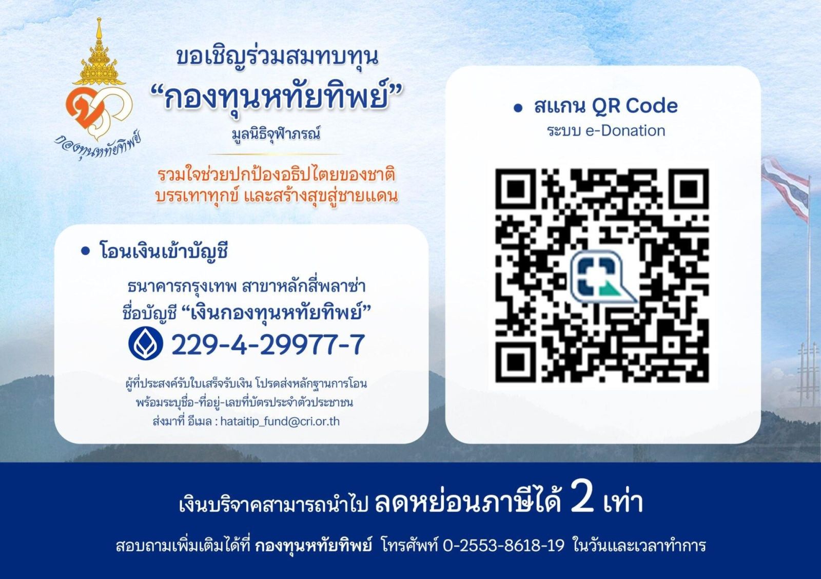 ผู้มีจิตกุศลร่วมบริจาคสมทบฯ ได้ที่สำนักงาน "กองทุนหทัยทิพย์" ชั้น 1 อาคารวิจัยเคมี สถาบันวิจัยจุฬาภรณ์ หมายเลขโทรศัพท์ 02-5538618-19 หรือ บัญชี ธนาคารกรุงเทพ สาขาหลักสี่พลาซ่า ชื่อบัญชี "เงินกองทุนหทัยทิพย์" เลขบัญชี 229-4-29977-7