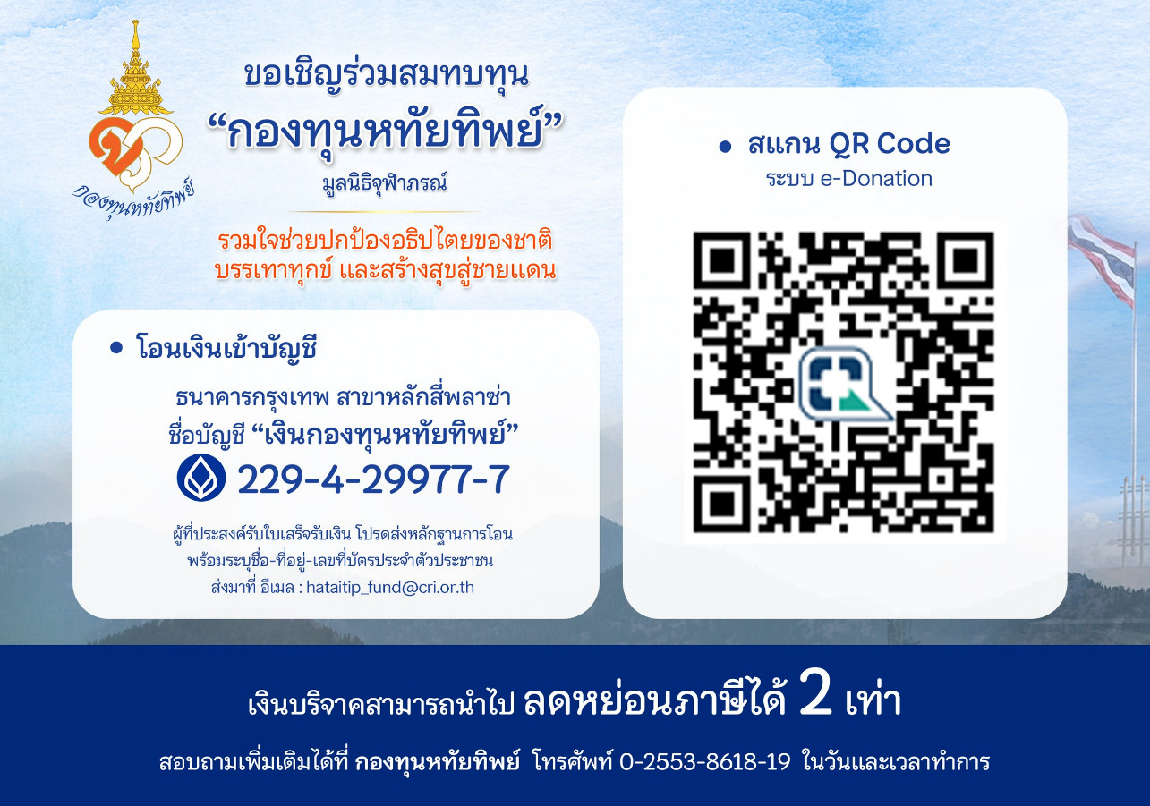คณะกรรมการบริหารกองทุนหทัยทิพย์ ขอเชิญพี่น้องประชาชนจากทุกภาคส่วนร่วมเป็นส่วนหนึ่งในการแสดงพลังปกป้องอธิปไตยของชาติ เพื่อการบรรเทาทุกข์และสร้างประโยชน์สุขสู่ประชาชนในพื้นที่ชายแดนอย่างยั่งยืน โดยบริจาคเงินสมทบ “กองทุนหทัยทิพย์” ได้ที่ ธนาคารกรุงเทพ สาขาหลักสี่พลาซ่า ชื่อบัญชี "เงินกองทุนหทัยทิพย์" เลขที่ 229-4-29977-7 หรือ สอบถามเพิ่มเติม ได้ที่ สำนักงานกองทุนหทัยทิพย์ โทรศัพท์ 0-2553-8618-19 ในวันและเวลาราชการ