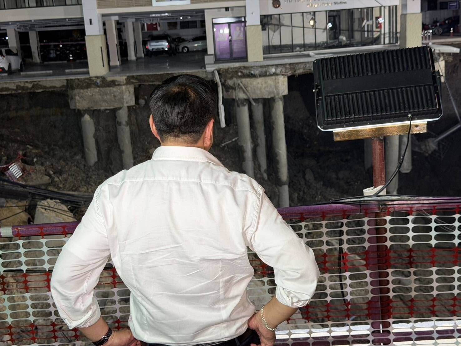 ส่วนสถานีตำรวจสามเสนนั้น ไม่ต้องเป็นห่วง เพราะส่วนที่ดินสไลด์ลงไปเป็นส่วนที่ไม่มีกำแพงกันดิน พร้อมขอบคุณนายสุชัชวีร์ สุวรรณสวัสดิ์ วิศวกร และอดีตอธิการบดีของสถาบันเทคโนโลยีพระจอมเกล้าเจ้าคุณทหารลาดกระบัง ที่ไปออกรายการ และไปอธิบายชุดเจนให้ทุกคนได้รู้ว่าส่วนที่อยู่นอกกำแพงกันดินอาจจะมีความอันตราย ฉะนั้นเราก็ต้องมาจัดการกับสถานการณ์ตรงนี้ ซึางกว้างความยาว ประมาณ 30 × 30 และลึกประมาณ 20 เมตร หากจะดูปริมาตรดินที่จะถมใส่ลงไป เพื่อจะคืนพื้นที่และลาดยางบนพื้นผิวถนน อยู่ที่ประมาณคิวดินหรือคิวหินคลุกไม่น่าจะเกิน 15,000 คิว ไม่ใช่จำนวนที่มากมายอะไร เราก็ต้องเร่ง เพราะตอนนี้เราปิดการจราจรทั้งหมด ซึ่งผู้รับจ้างก็จะทำงานทั้งวันทั้งคืน เพื่อคืนพื้นผิวการจราจร ซึ่งจะซ่อมแซมความเสียหายข้างล่างต่อก็ว่ากันไป
