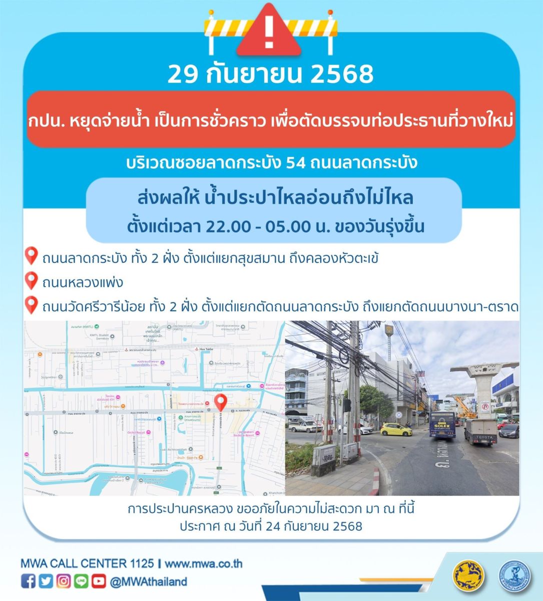 การประปานครหลวง (กปน.) ขอแจ้งให้ทราบว่า จะดำเนินการตัดบรรจบท่อประธานเดิมเข้ากับท่อประธานที่วางใหม่ ในพื้นที่บริเวณซอยลาดกระบัง 54 ถนนลาดกระบัง เพื่อให้ประชาชนได้รับบริการน้ำประปาอย่างเพียงพอและทั่วถึง จึงมีความจำเป็นต้องหยุดจ่ายน้ำ เป็นการชั่วคราว ในคืนวันจันทร์ที่ 29 กันยายน 2568 ตั้งแต่เวลา 22.00 - 05.00 น. ของวันรุ่งขึ้น โดยระหว่างดำเนินการ ส่งผลให้ น้ำประปาไหลอ่อนถึงไม่ไหล ในพื้นที่ดังต่อไปนี้