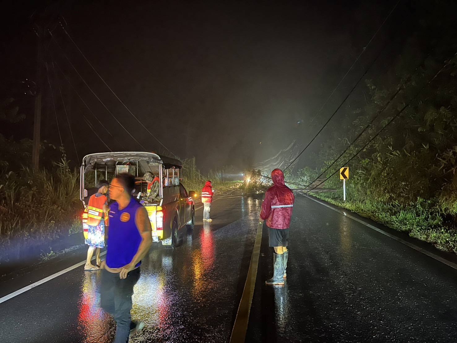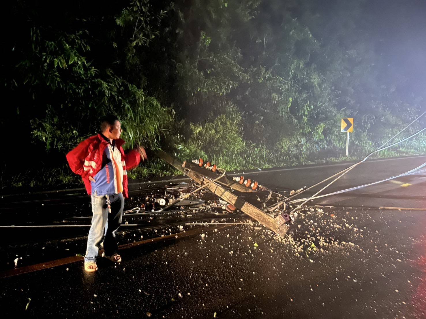 เสาไฟฟ้าล้ม ขวางถนนทางหลวงหมายเลข 108 ใกล้สามแยกป่าแป๋ อ.แม่สะเรียง จ.แม่ฮ่องสอน จนท.เข้าพื้นที่เร่งเคลียร์เส้นทาง