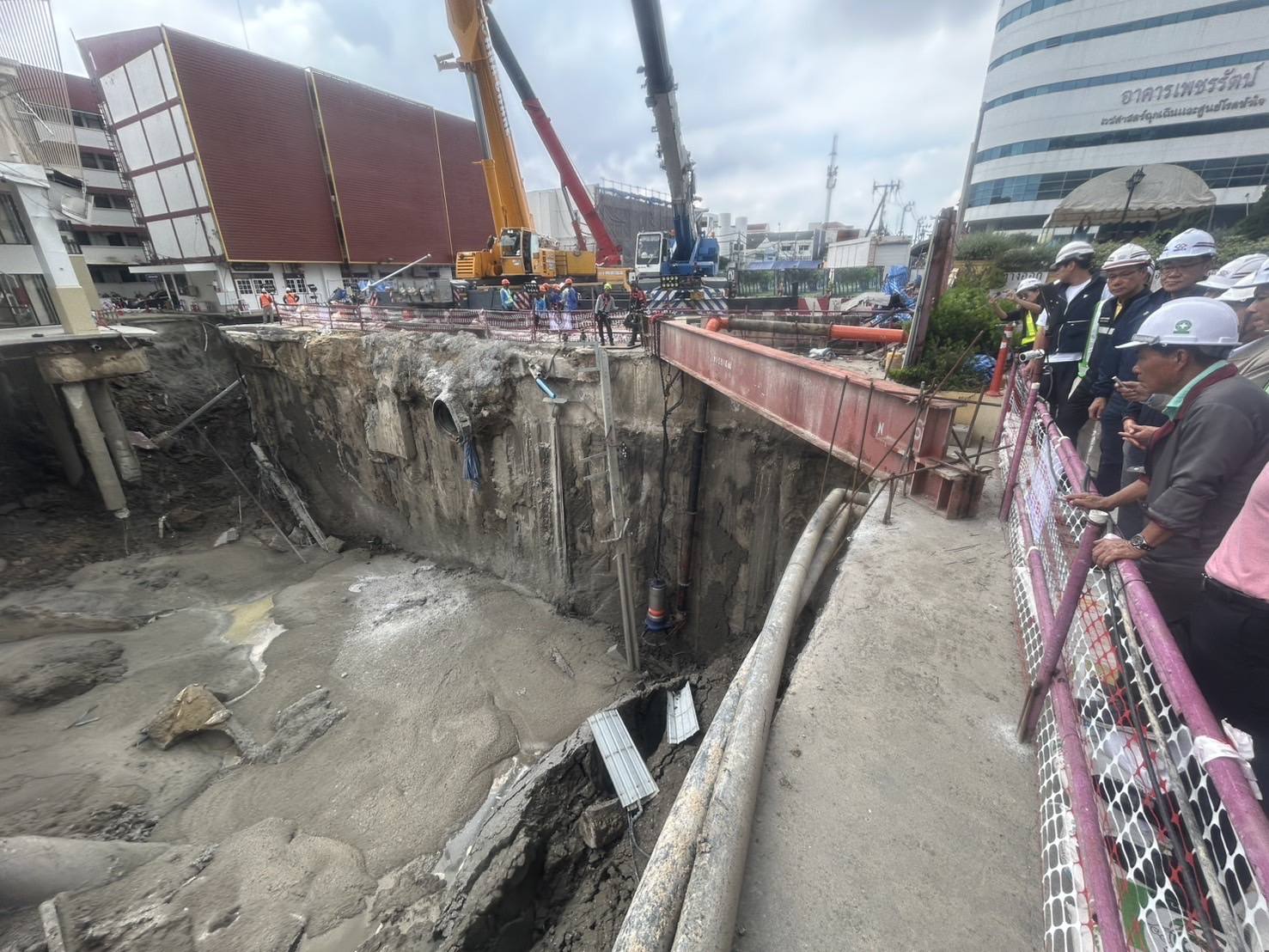 อย่างไรก็ตาม ในช่วงที่ผ่านมาจะมีฝนตกเล็กน้อย แต่ไม่มีผลกระทบต่อแผนงานในภาพรวม ทั้งนี้ ได้มีการจัดเตรียมเครื่องสูบน้ำ และวางกระสอบทรายกั้น ในกรณีที่มีฝนตกหนักอย่างต่อเนื่อง สำหรับการยกวัสดุสิ่งของ เช่น เสาไฟฟ้า หม้อแปลงไฟฟ้า ท่อน้ำประปา และ เศษวัสดุอื่นๆ ที่อยู่ภายในหลุม ได้ทยอยนำขึ้นมาบางส่วนก่อน ซึ่งต้องดำเนินการด้วยความระมัดระวัง และต้องคำนึงถึงความปลอดภัยของเจ้าหน้าที่ผู้ปฏิบัติงานทุกคน ในส่วนของประชาชนที่ได้รับผลกระทบด้านที่อยู่อาศัย ทางผู้รับจ้างงานโยธารายงานว่า สามารถติดต่อผู้ได้ผลกระทบแล้วและได้จัดหาที่พักให้ระหว่างการซ่อมแซมต่อไป